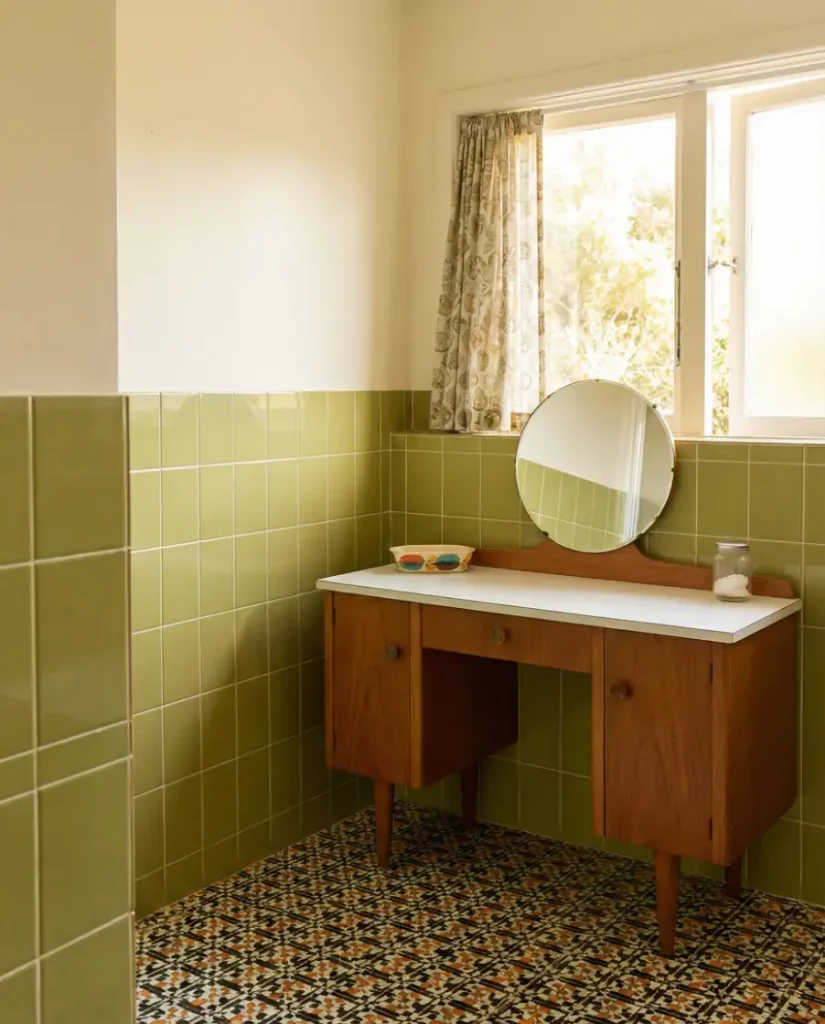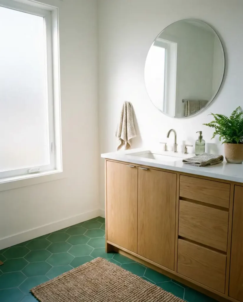 Retro-inspired bathrooms are back, and green tile plays a starring role. Paired with bold floor patterns and nostalgic fixtures, Retro green tile feels playful yet grounded. These flooring ideas often draw from mid-century references while staying functional.