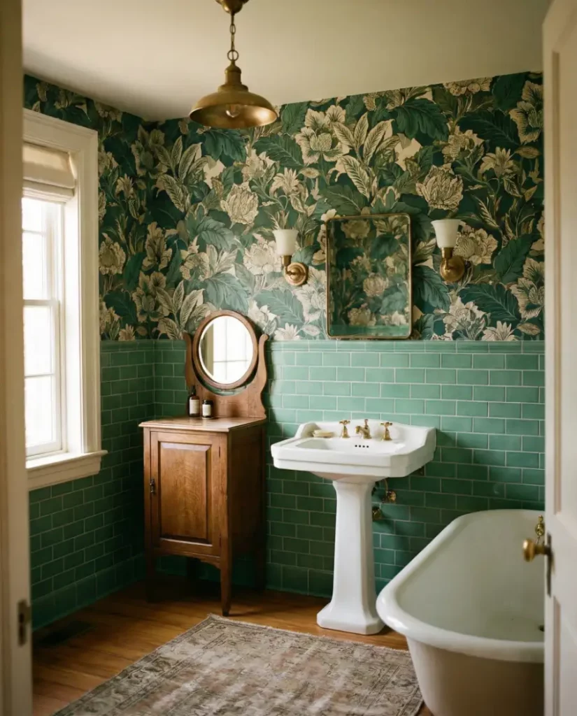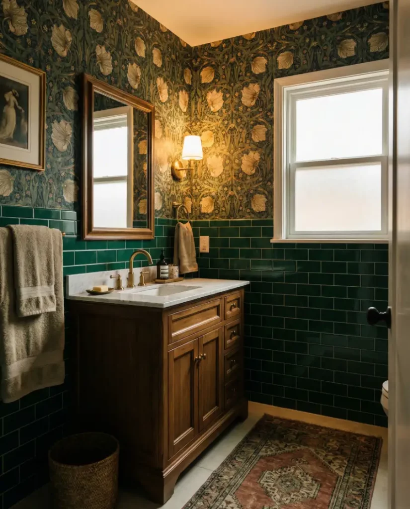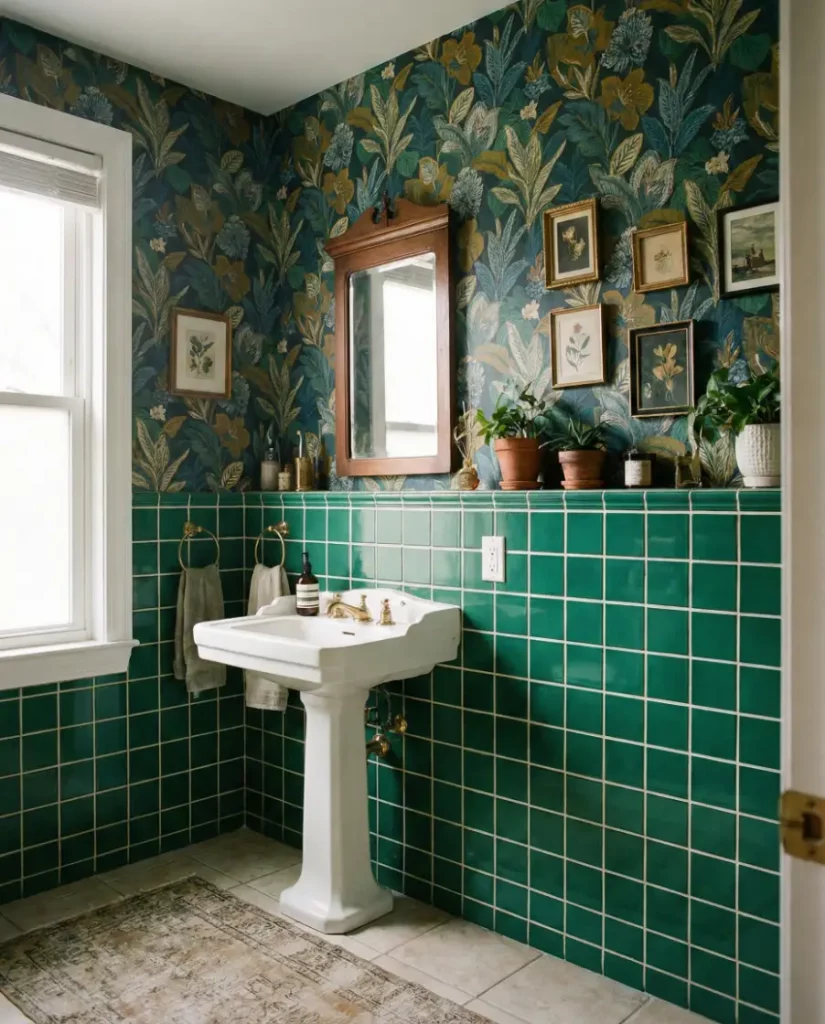 Layering tile and pattern is gaining traction in green tile bathrooms. Using tile below and bold with wallpaper above adds personality without overwhelming the space. This balance allows homeowners to experiment while keeping structure intact.