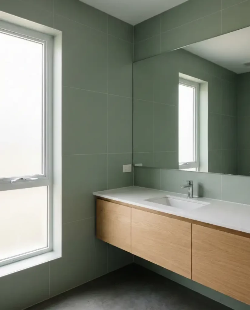 Large green tiles create a smoother, more architectural look by minimizing grout lines. Used across the wall, they make bathrooms feel more expansive and intentional. This approach suits modern layouts where clean surfaces matter as much as color.