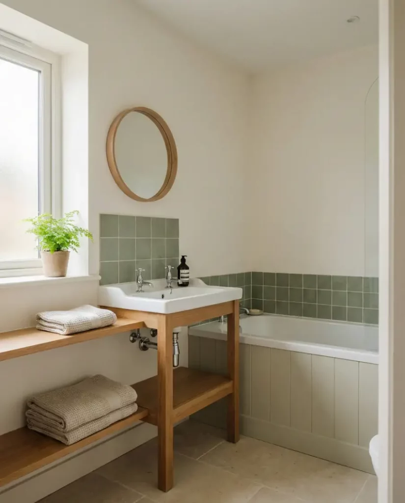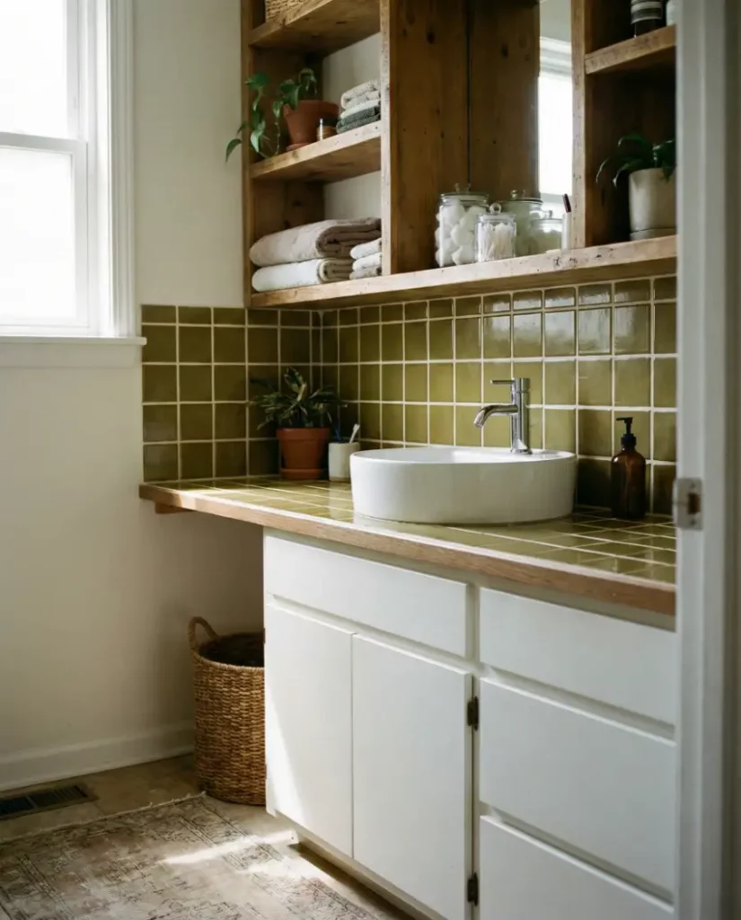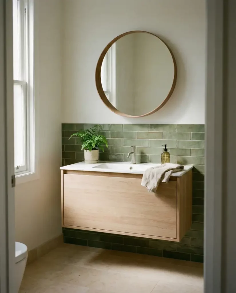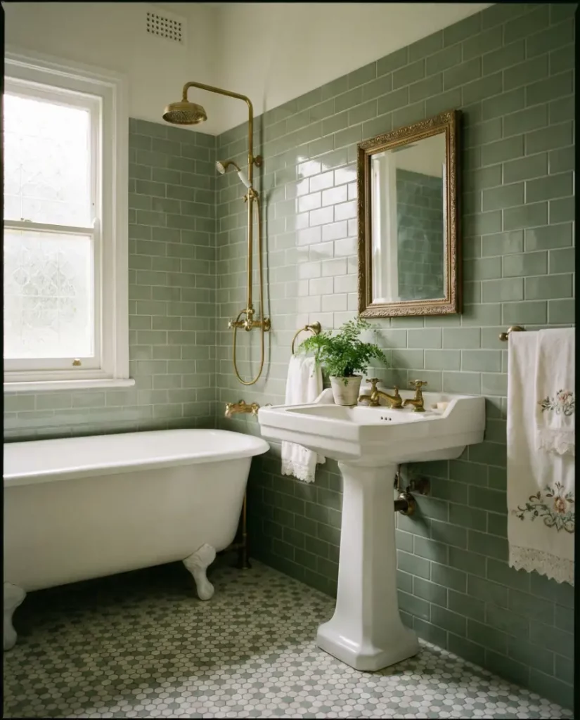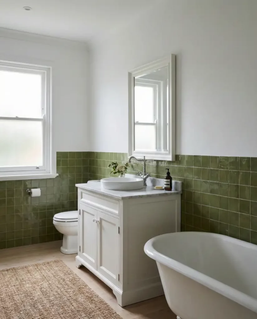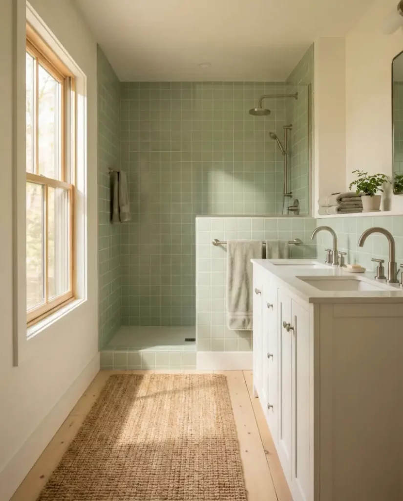 I once stayed in a small guest bath like this in a 1920s bungalow, and the sage tile made the space feel instantly calm. It didn’t shout for attention, but it lingered in memory, which is exactly why homeowners keep returning to this shade.