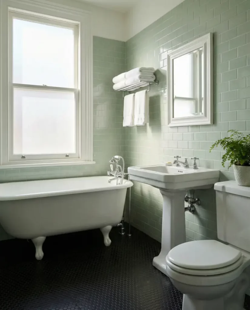 Pale green tile creates striking contrast when paired with a Black floor. These lighter Pale hues soften the boldness below while still delivering color. The pairing is especially effective in bathrooms with strong geometry or classic layouts that benefit from clear visual separation.