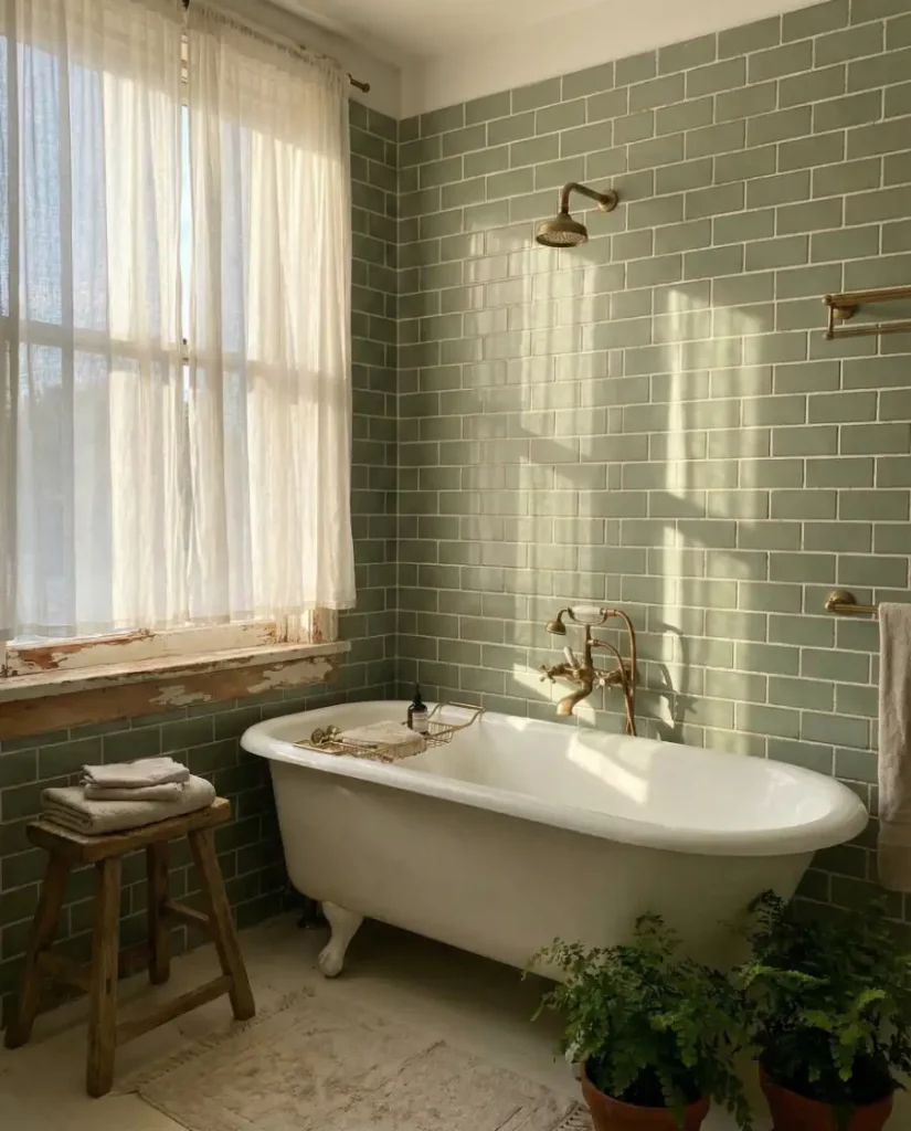 Sage green tile continues to dominate Pinterest saves, especially when paired with vintage details. This softer hue sits comfortably between warm and cool, making it ideal for Interior design schemes that reference the past without feeling dated. In sage-toned bathrooms, classic layouts get a gentle refresh through color alone.