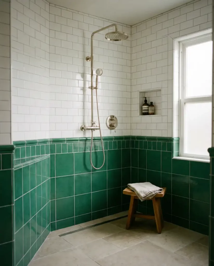 Combining White and green tile creates a bathroom that feels timeless rather than trendy. This approach keeps green tile bathrooms bright while allowing color to quietly shape the mood. Often used in subway or stacked layouts, the pairing feels familiar yet fresh.