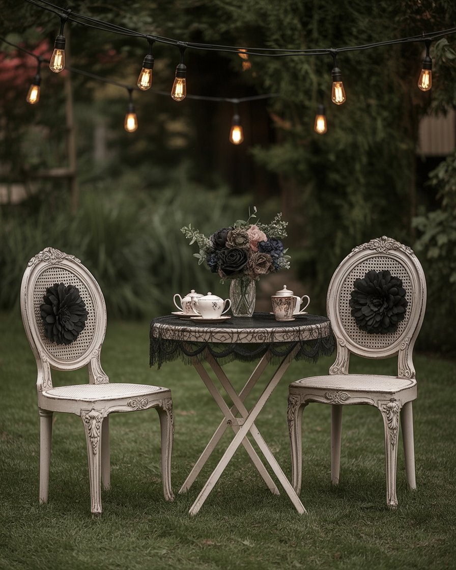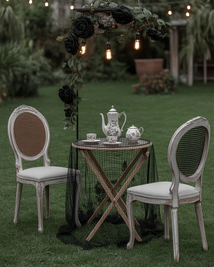 A vintage outdoor display screams October-and in 2025, it is all about making it have personality. To set the stage just picture a Victorian tea set out on your porch or patio with old 19th century chairs upholstered in black lace and with soft candle lighting. Warm Edison bulbs create that fall and cozy-meets-dim-and-spooky mood. A couple diy lace table runners, mismatched teacups, dark floral arrangements and you have created a memorable outdoor setting to be remembered by your guests many years in the future.