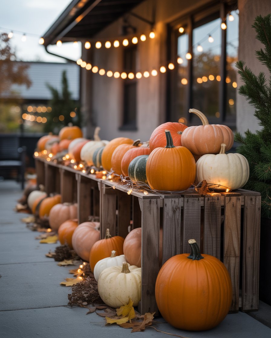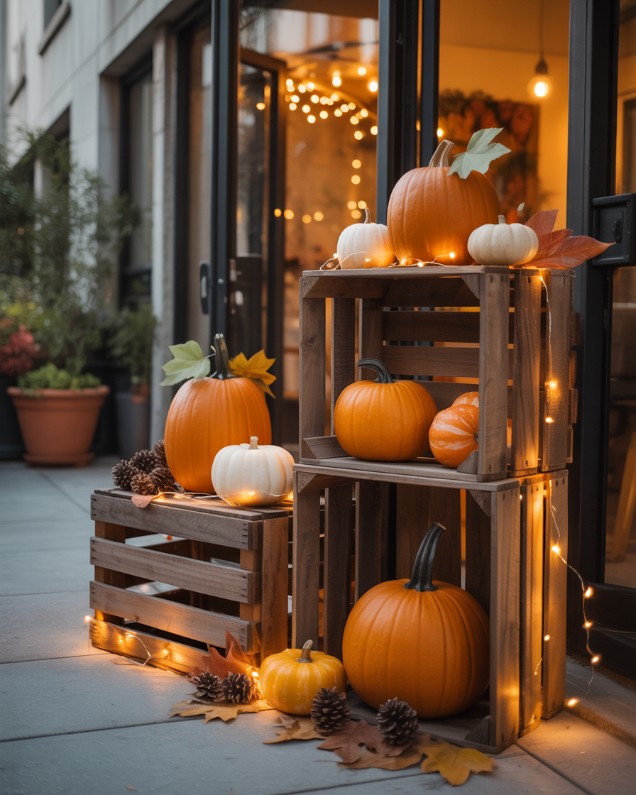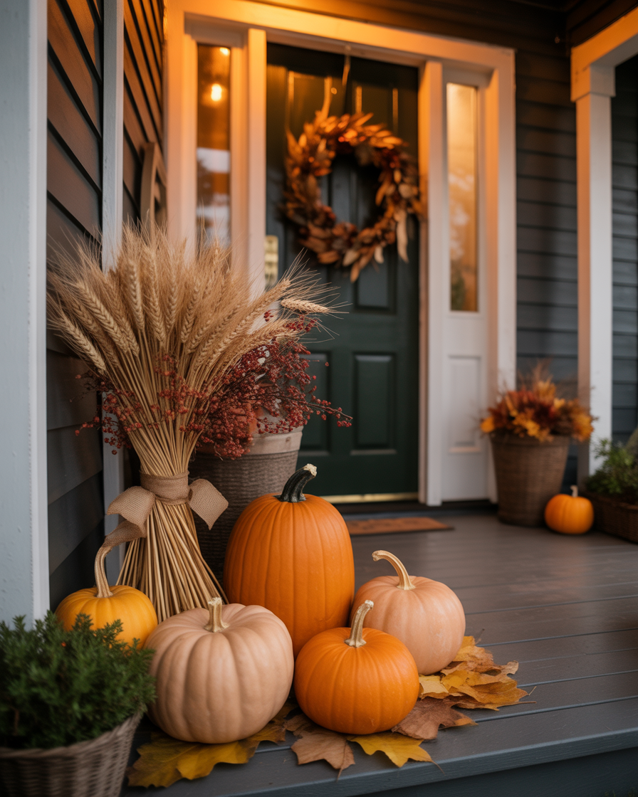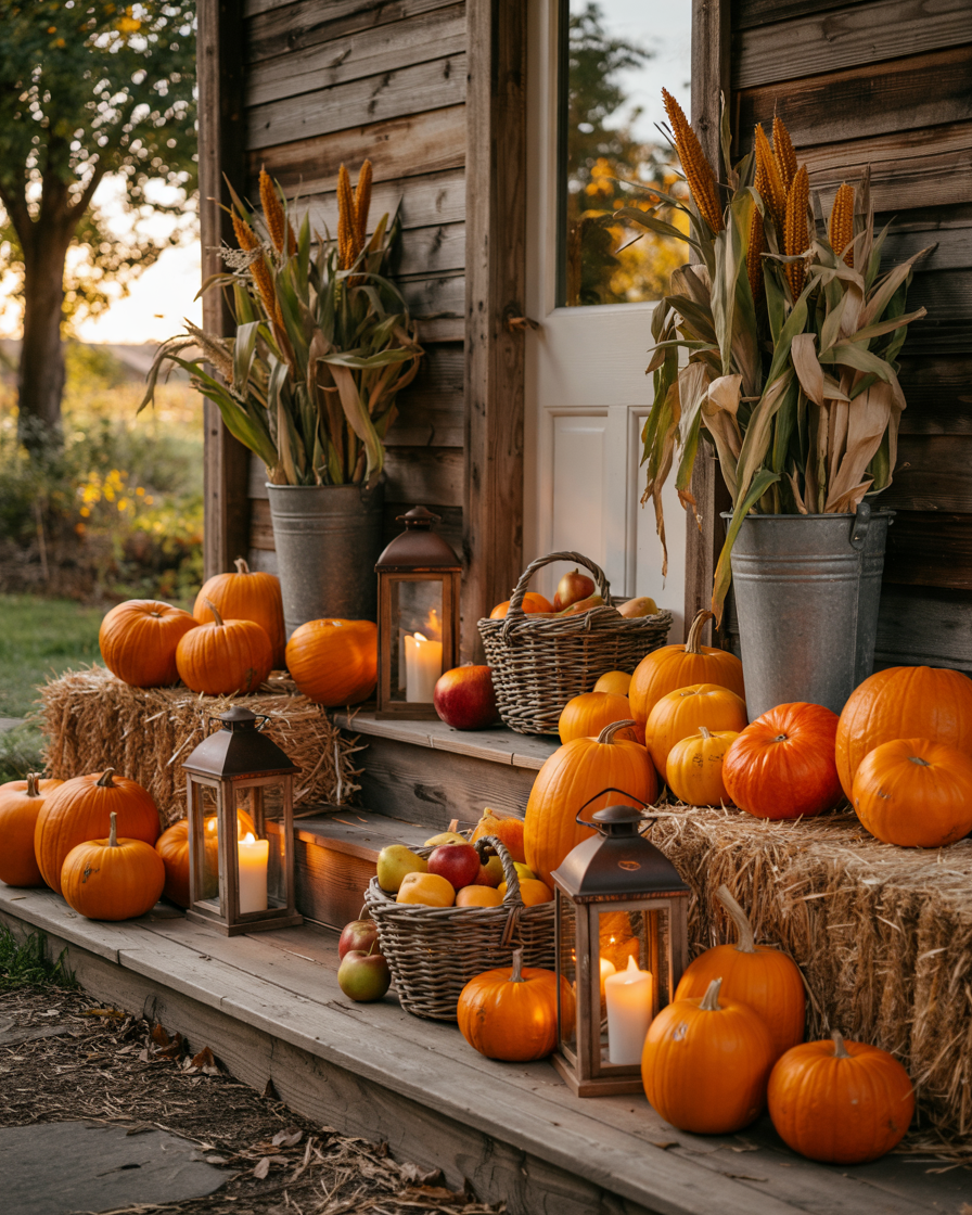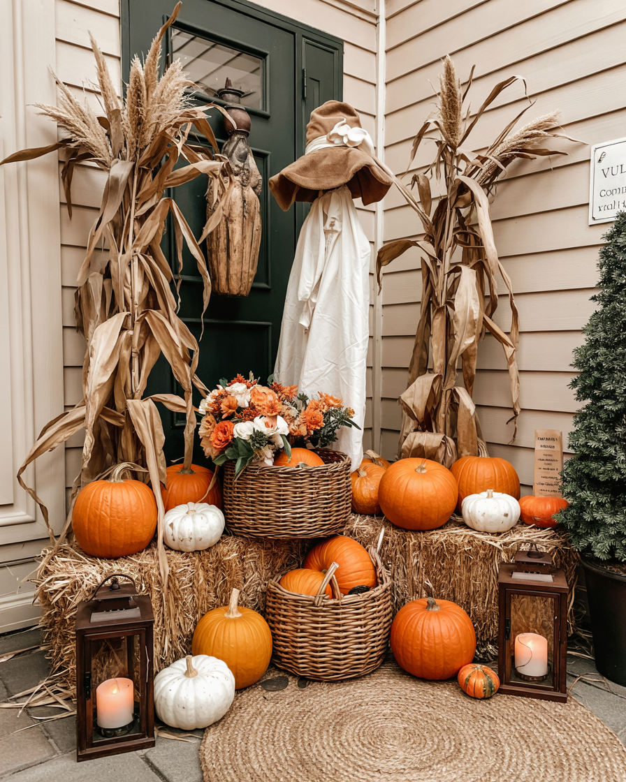 A simple outdoor setup of grouped harvest displays can charm kids and adults alike. Arrange clusters of pumpkins, hay bales, and cornstalks along the driveway or small porch. Add diy touches like painted gourds, rustic baskets, and second-hand lanterns for character. It’s festive for outside without being overly spooky, and it works beautifully for both day and evening.