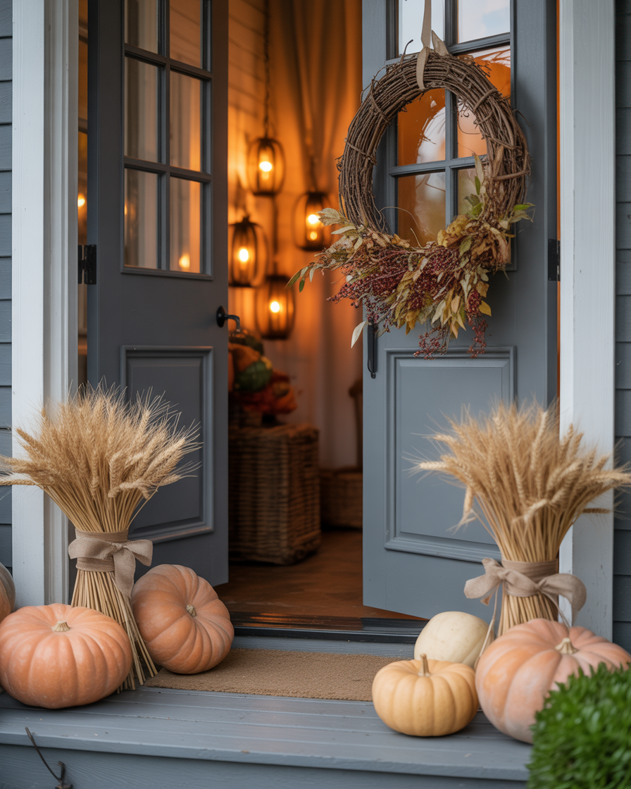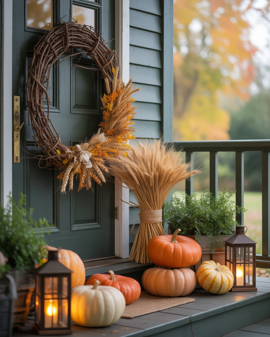 For a Christian-friendly fall and theme, decorate your porch or small porch with natural grapevine wreaths accented with wheat, pumpkins, and scripture ribbons. Add soft lighting for the home to keep it warm and inviting for outside gatherings.