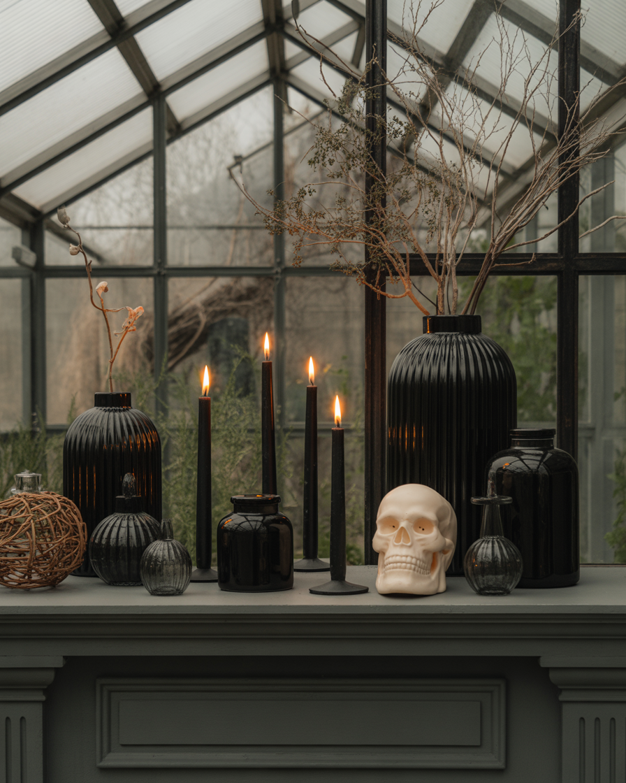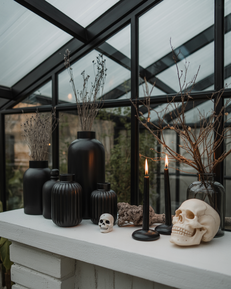 If you prefer indoor simple style, a fireplace mantel can be your Halloween focal point. Place glass vases of black taper candles, porcelain skulls and dried long branches altogether. A bit of artificial fog drifting across adds depth. This look works beautifully for the home, whether it’s in the home living room or a cozy apartment patio nook.