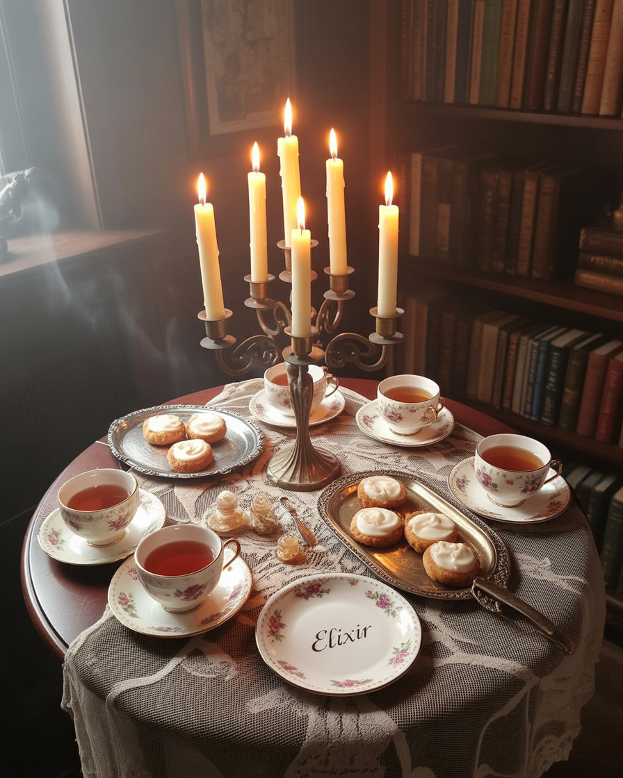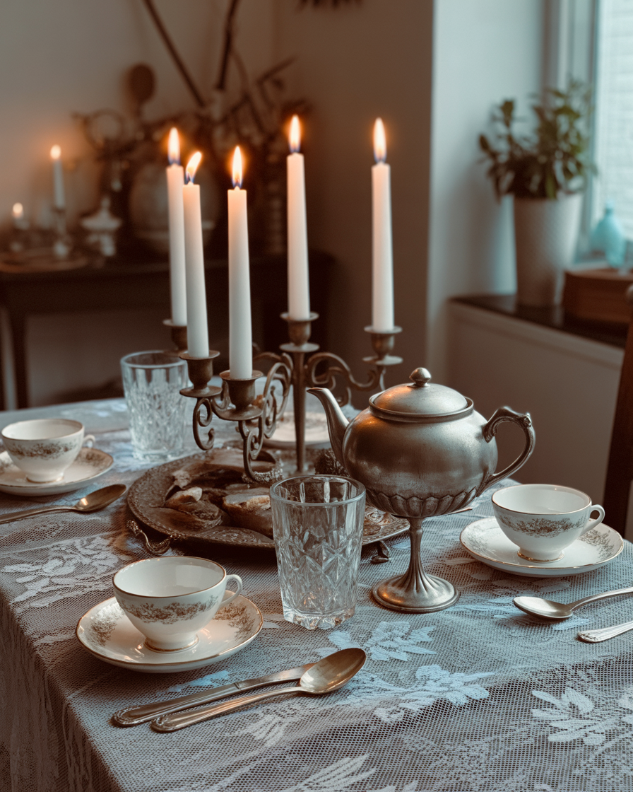 Transform your vintage indoor dining area into a whimsical witch’s tea party. Layer lace tablecloths, mismatched teacups, and tarnished silver trays. Put some black cat figurine on the table and floating candles. This scene works for the home or for office Halloween luncheons, combining charm and a touch of spooky elegance.