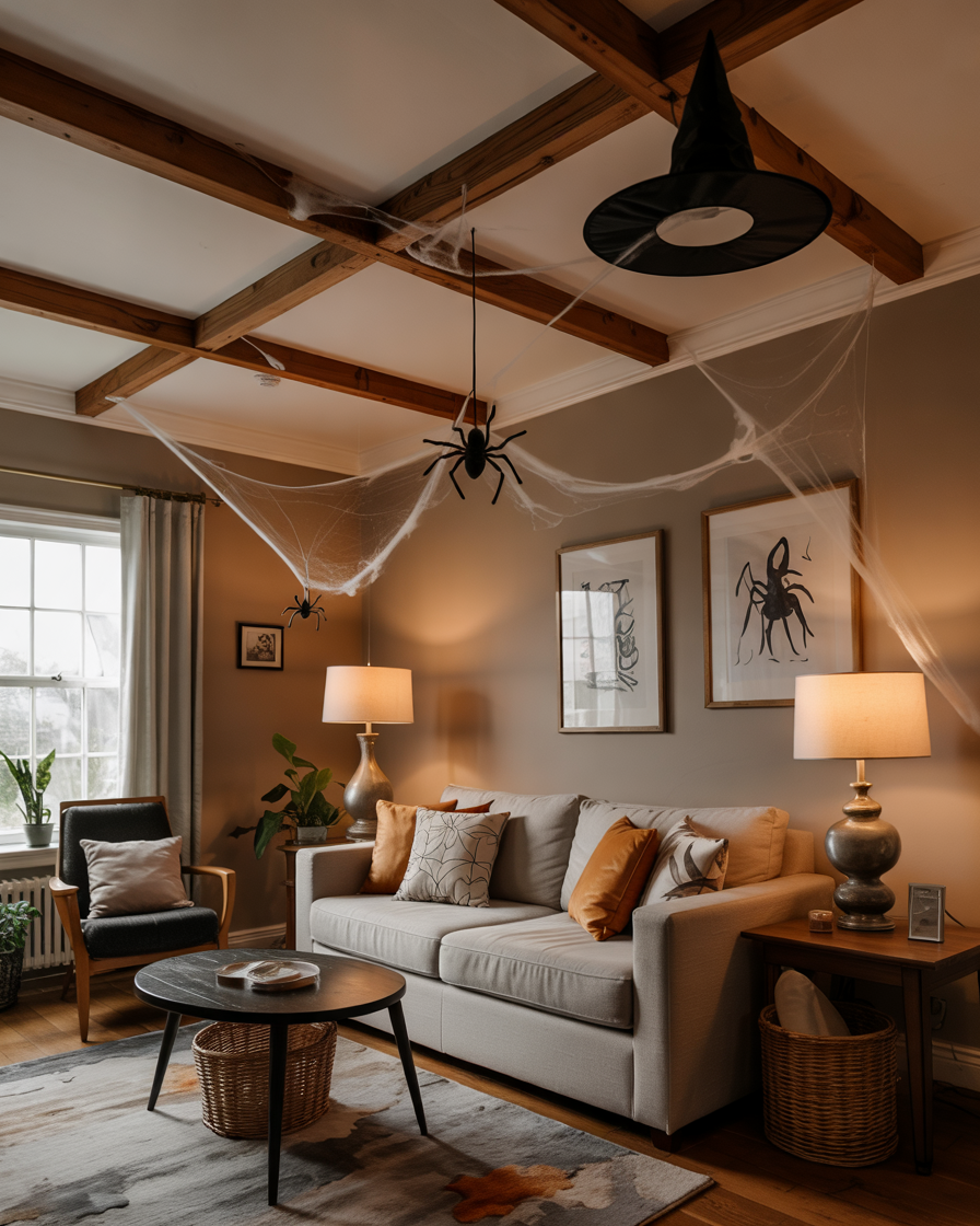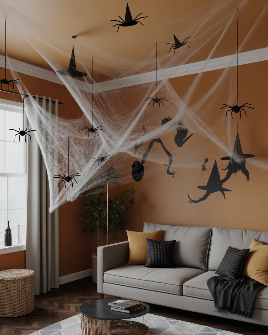 In the home living room, make a statement by covering the ceiling with soft, stretchable cobwebs. And use fishing wire to hang small dangling spiders and a couple of floating witch hats. This immersive indoor design turns the whole room into a Halloween experience for the home or for office parties.