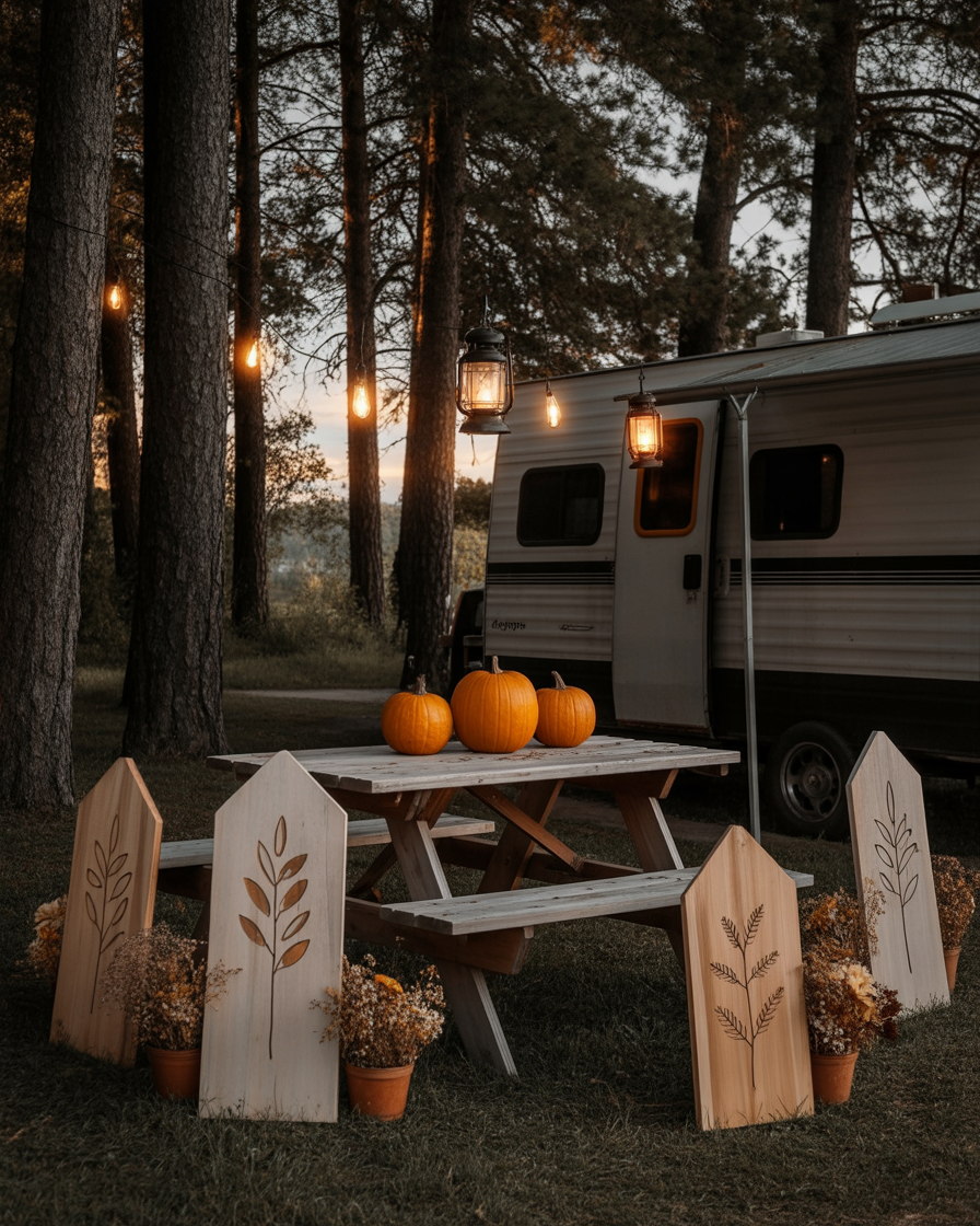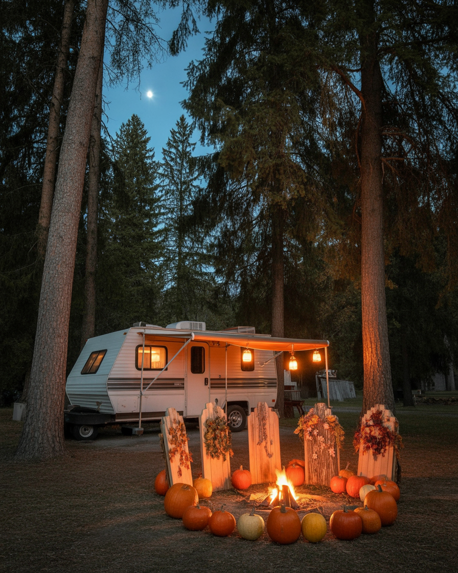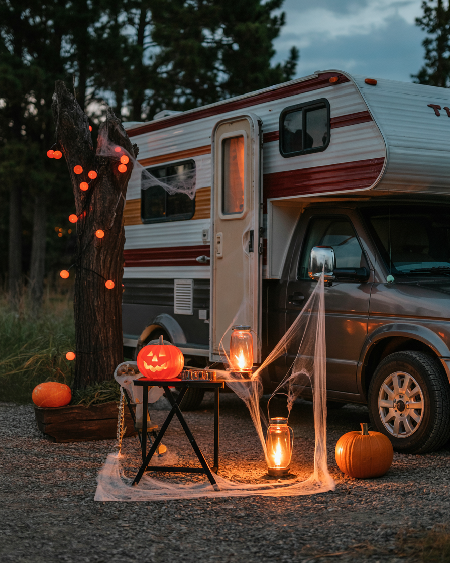 At your rv campsite, hang ghost-shaped lanterns along the awning and add glowing jack-o’-lanterns to picnic tables. Simple grave marker or two staked in the ground provides instant Halloween appeal to the outside. Perfect for travelers celebrating on the road.