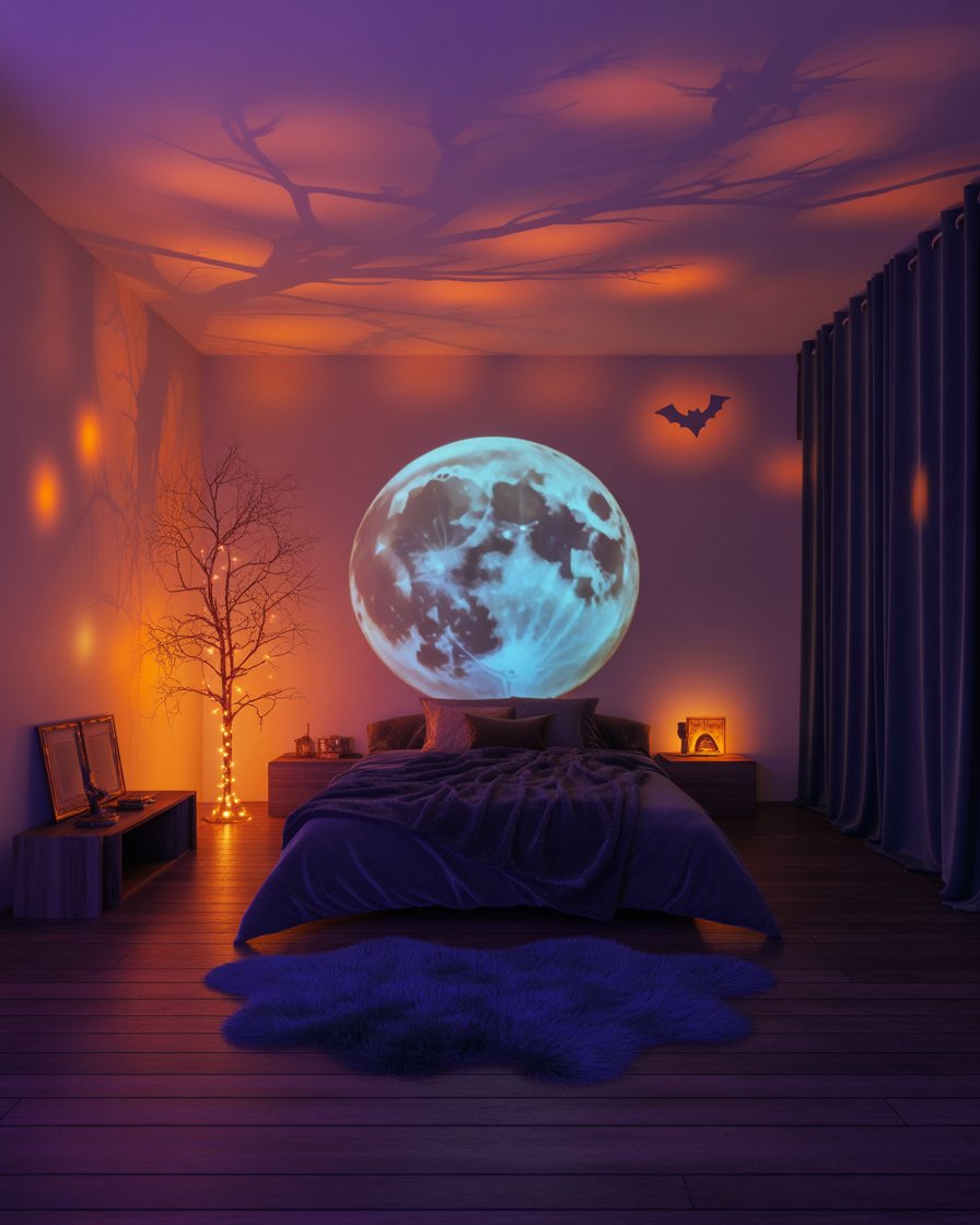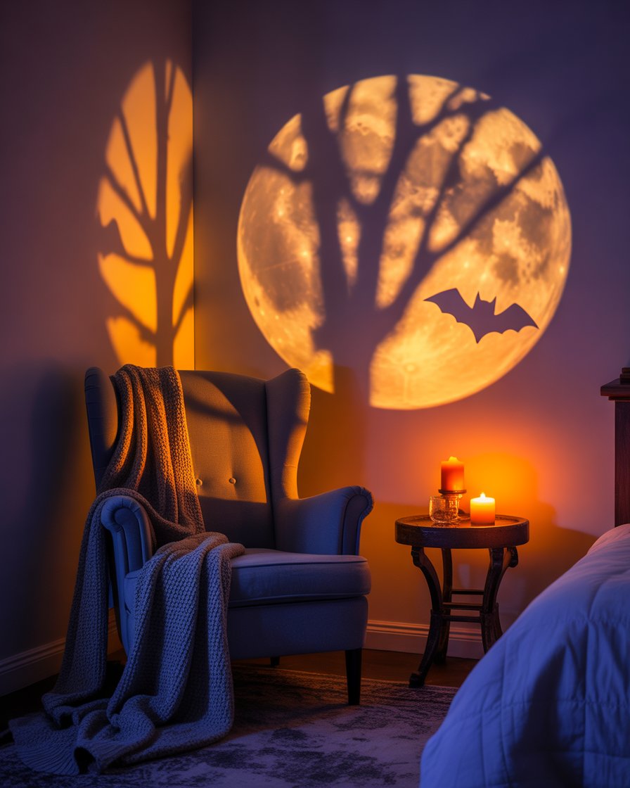 For a dreamy yet eerie bedroom setup, project a large glowing moon on the wall and add shadow cutouts of bats or tree branches. This indoor simple design works wonders in small spaces and instantly creates a cozy Halloween mood for the home without heavy decorations.