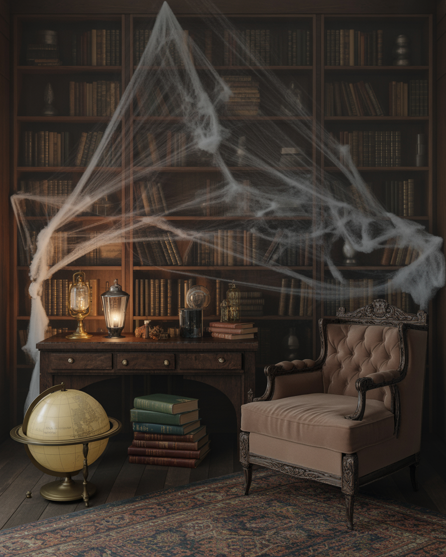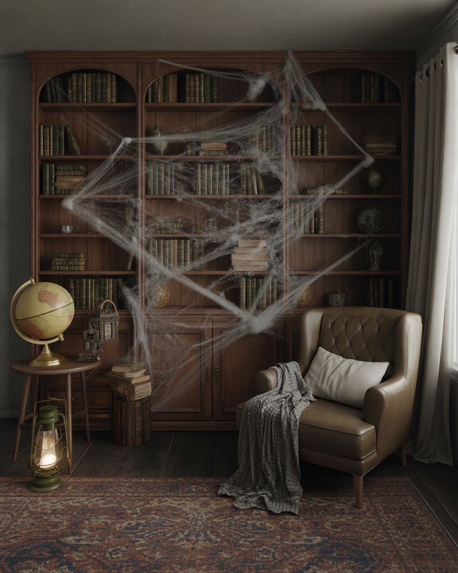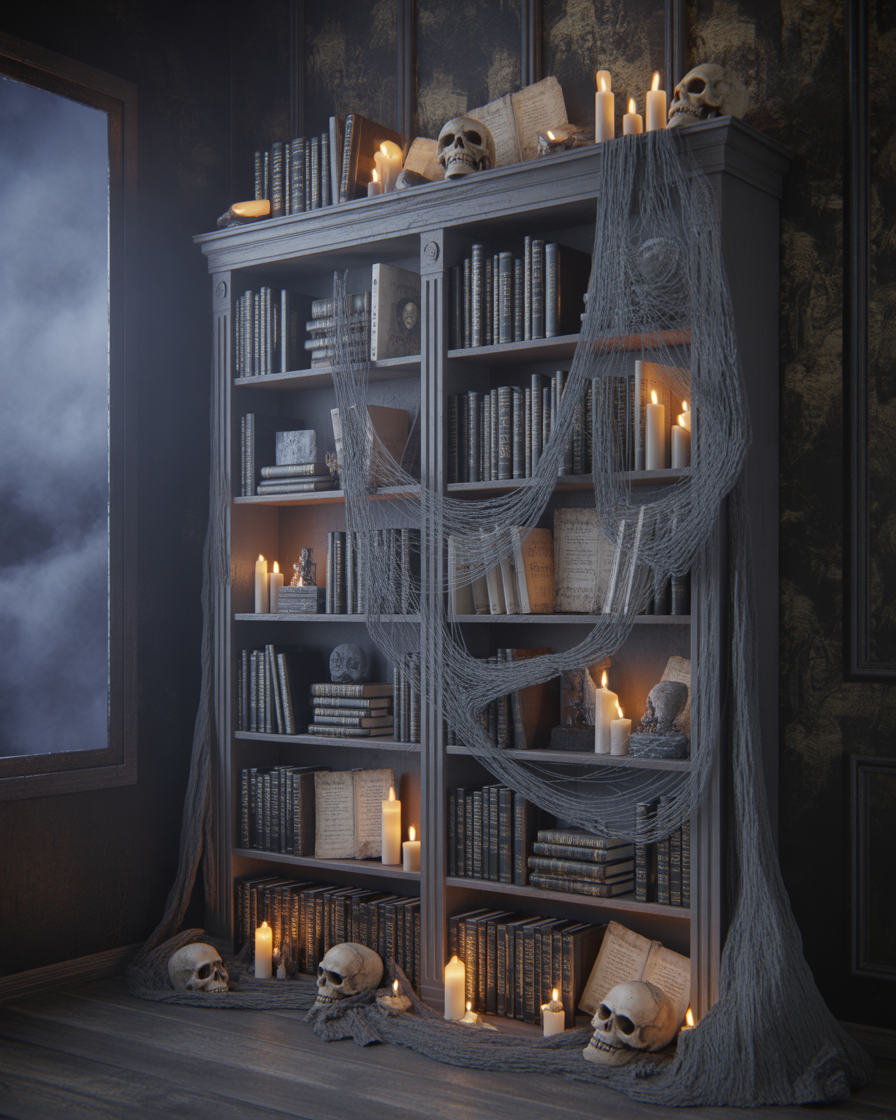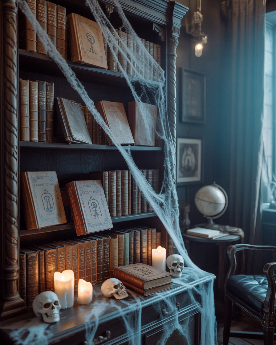 Give your for office or living room bookshelf a spooky makeover by replacing a few books with diy “spell tomes” wrapped in aged paper. Include flickering LED candles, a couple skulls and some strands of cobweb among shelves. This vintage indoor touch makes your work or reading area feel like a sorcerer’s study.