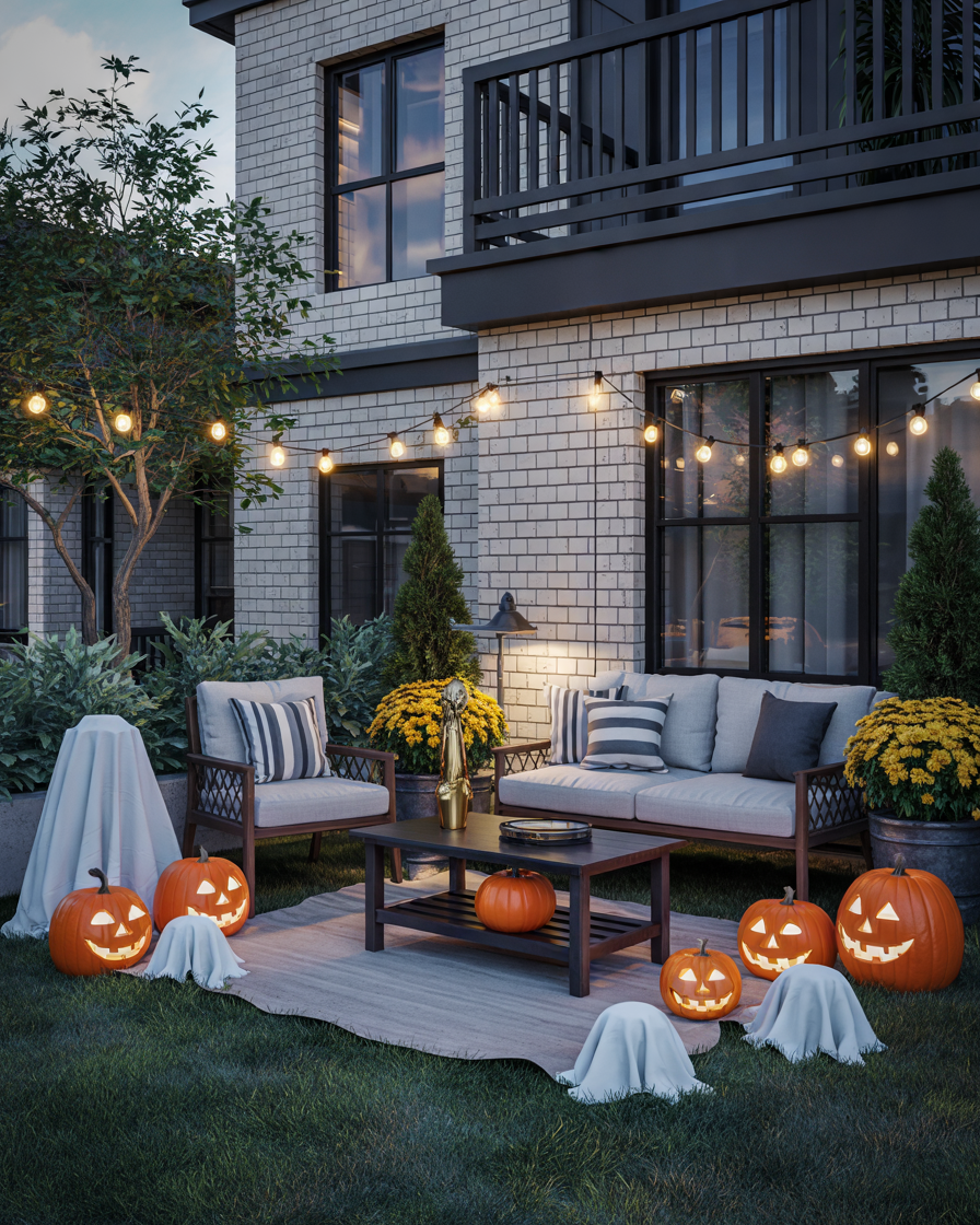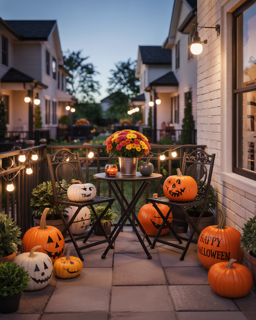 Gamers will love this — a Bloxburg-style apartment patio with playful Halloween elements. To replicate that in-game ambiance, use miniature furniture, incandescent string lights, and decals depicting themes of the game. Just add some potted mums and a smiling ghost to add the outside touch. This is ideal for those short on space but big on seasonal spirit.
