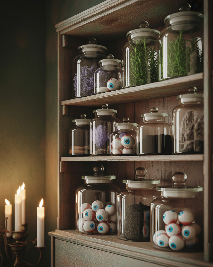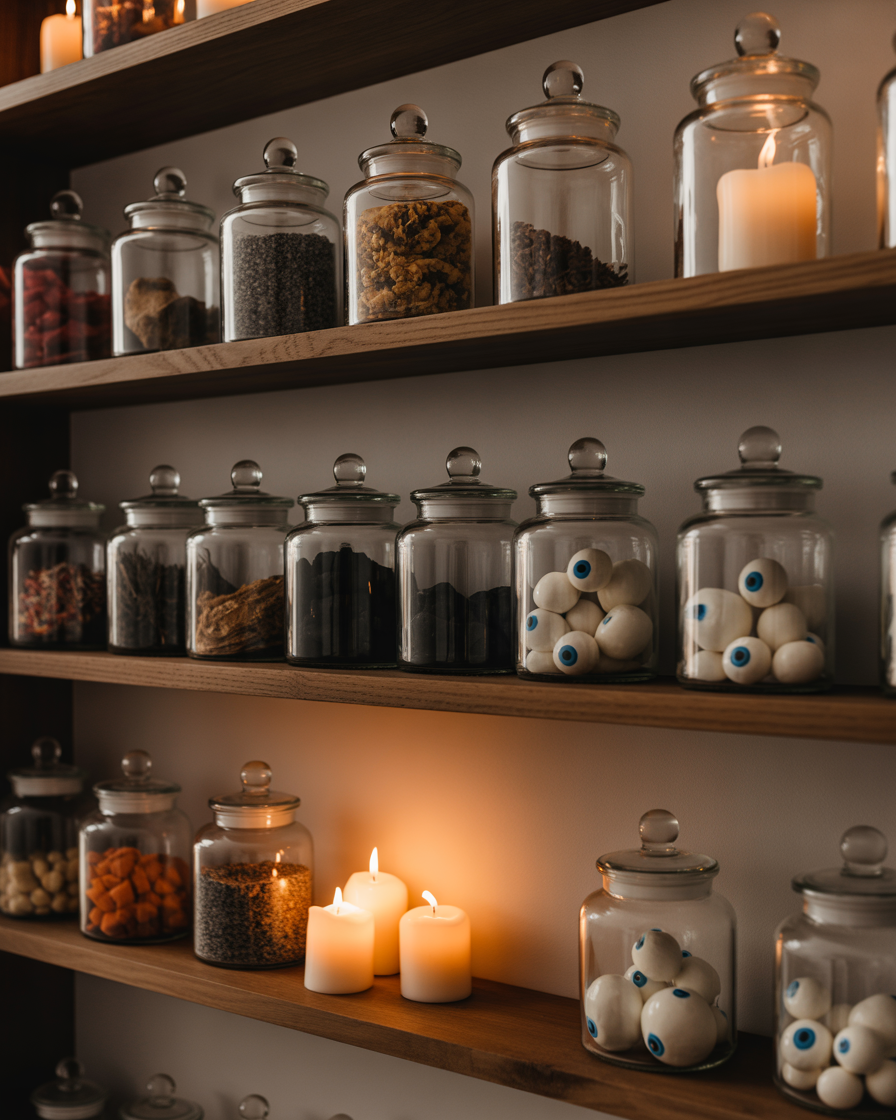 A vintage indoor apothecary brings old-school magic into your living room or even for office spaces. Put in glass jars the so-called mystery ingredients such as herbs that have dried, black sand or candy eyeballs. Place them on dark wooden shelves with handwritten labels. Pairing this indoor setup with fall and candlelight creates a warm, spooky backdrop.