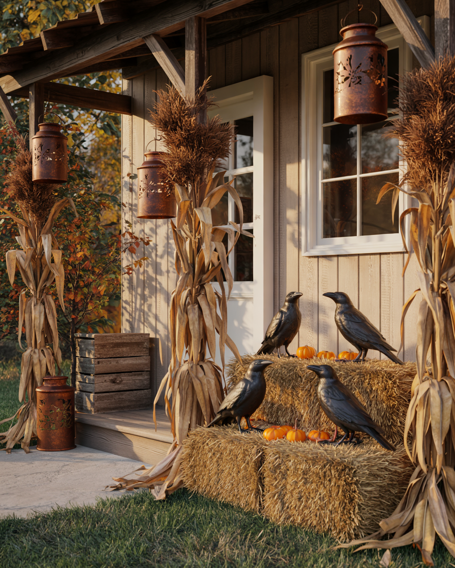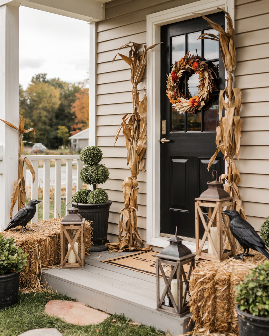 Mix fall and harvest charm with a spooky twist on your small porch. Combine the corn stalk with the hay bales and black ravens and destroyed lanterns. Use a muted color palette so it feels cohesive, perfect for outside or even for office entryways that need seasonal charm without going overboard.