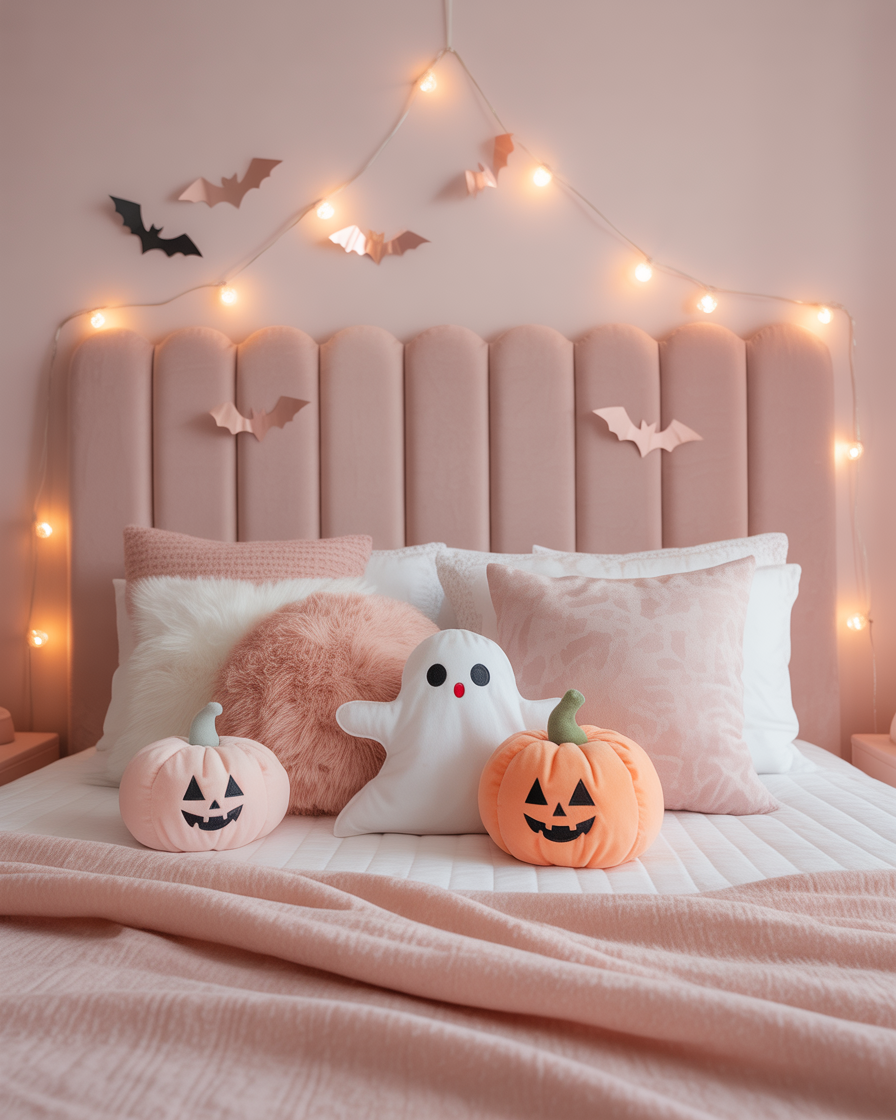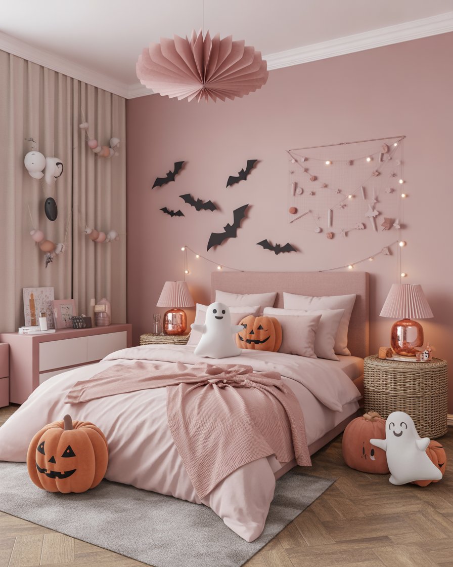 Blending soft pink tones with Halloween may sound unusual, but it’s one of the most charming ideas bedrooms enthusiasts have embraced this year. Think aesthetic cozy touches like fluffy blankets, Halloween bedding in blush hues, and playful ghost and pumpkin plushies. Add easy diy accents such as paper bats or ideas diy projects like painting miniature pumpkins with pastel glitter. Perfect for those who want their spooky season to feel cute rather than creepy.