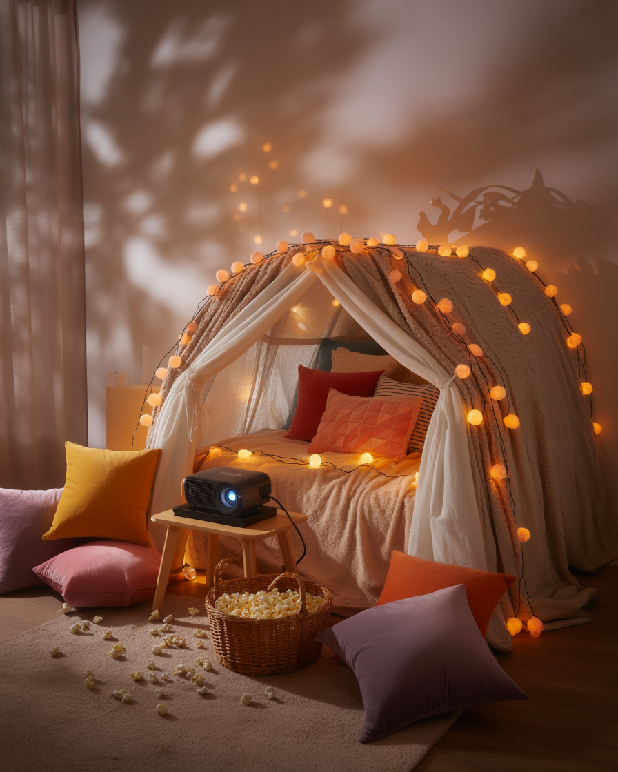 For the ultimate aesthetic cozy Halloween experience, build a blanket fort in your bedroom using fairy lights, thick throws, and plenty of cushions. Include a laptop or projector one to have a Halloween movie marathon. This ideas diy setup works perfectly for solo nights or small gatherings.