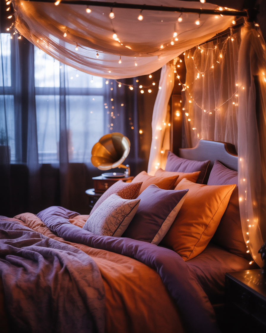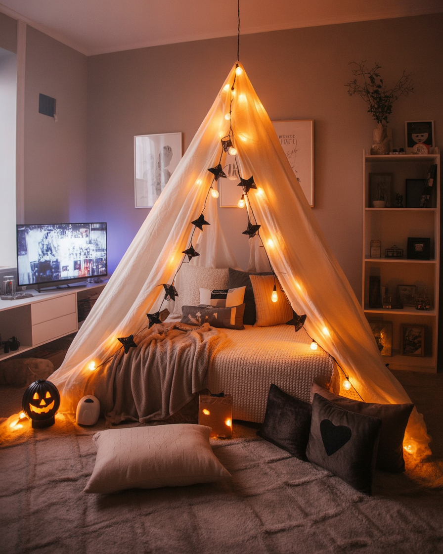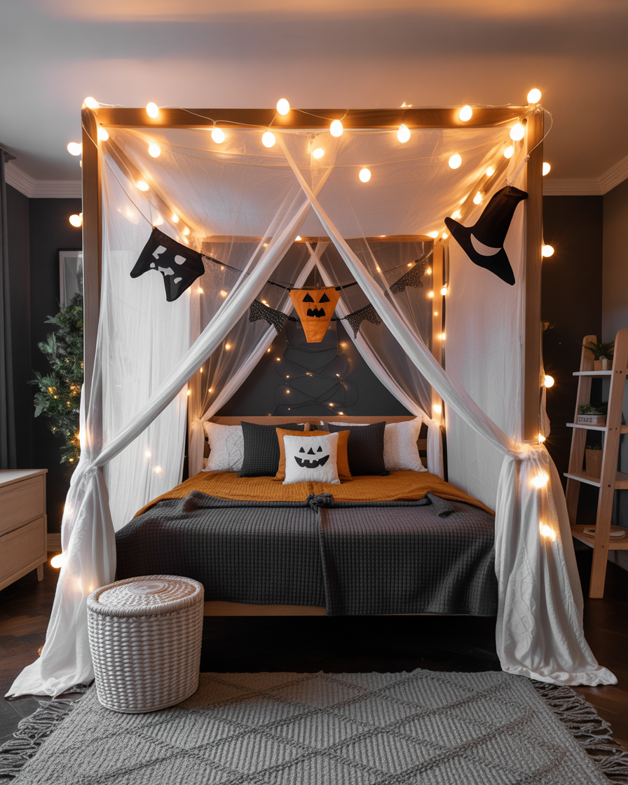 Upgrade your bedroom with a sheer canopy draped over the bed and layered with warm string lights. Include seasonal Halloween bedding and throw pillows to give a visual cozy feel. This is one of those easy diy ideas that makes your space feel magical for the season.