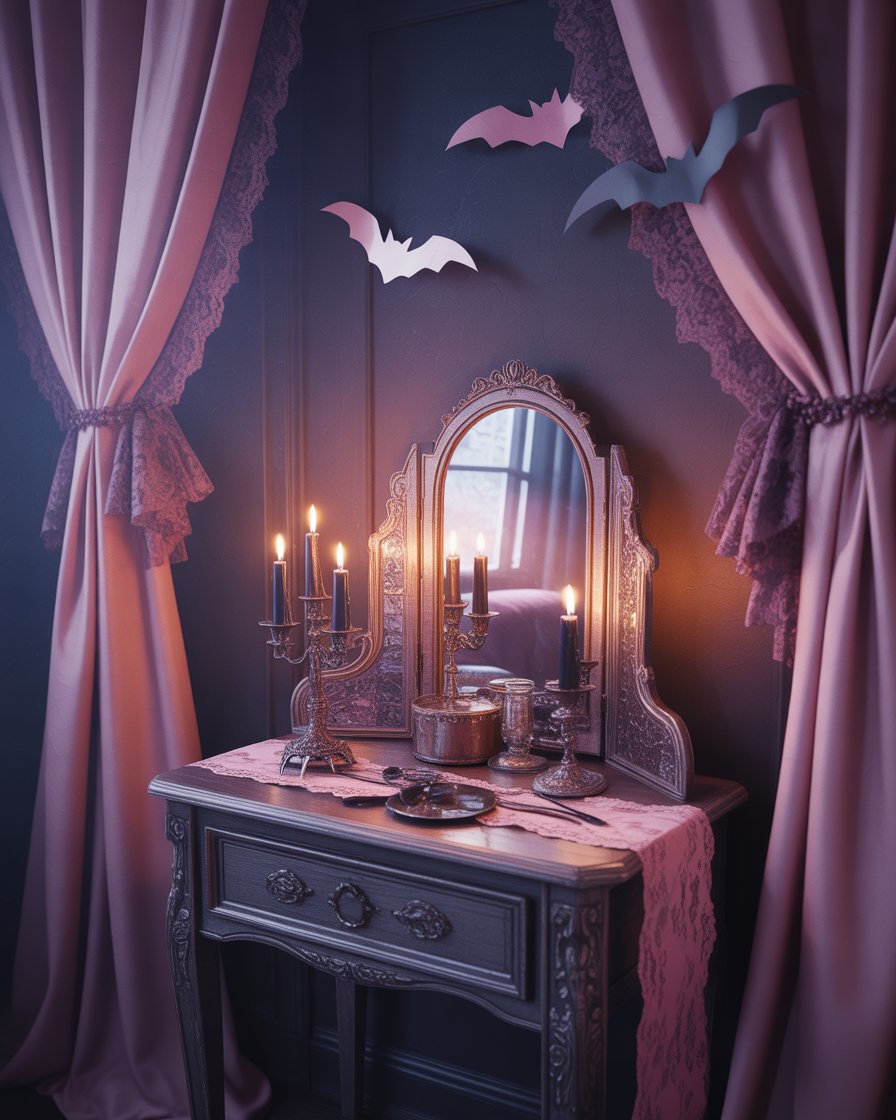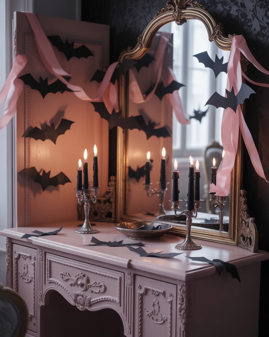 Mixing gothic drama with soft pink accents is one of 2025’s most intriguing twists. Just imagine a vanity table where you can see black candleholders, an old mirror and some romantic pastel candles. Get creative diy suggestions such as repainting an old frame in pink and putting on it some small bats made of paper. This creates a perfect balance between dark elegance and gentle charm, making it a standout in ideas bedrooms.