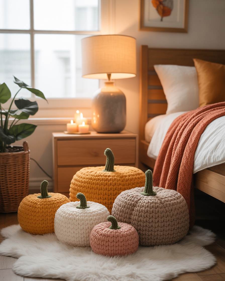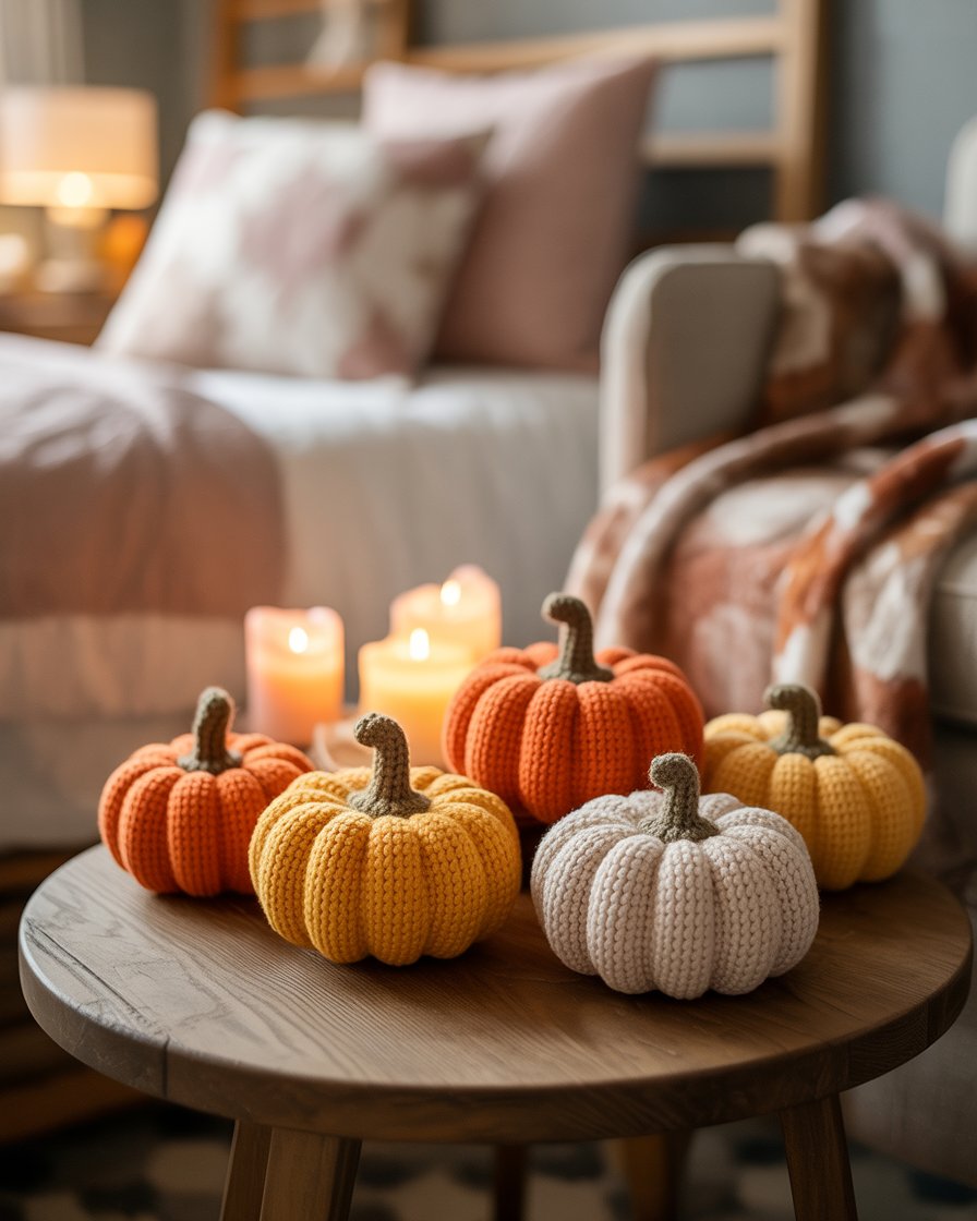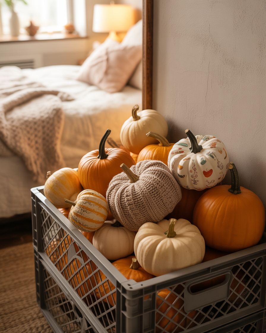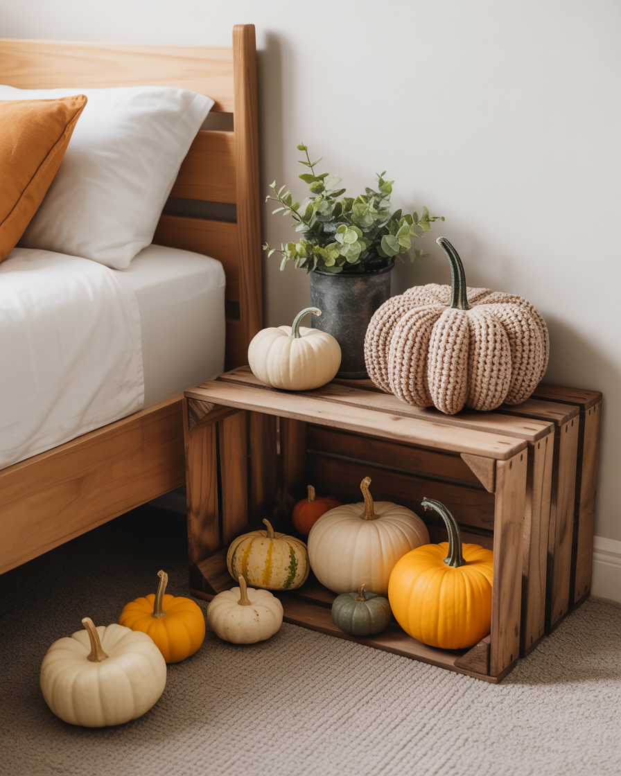 Bring rustic warmth into your bedroom with wooden crates filled with decorative pumpkins. Combine natural and painted white and orange pumpkins and a few crochet ones to make the texture. This aesthetic diy approach doubles as both seasonal decor and functional storage for blankets or books.
