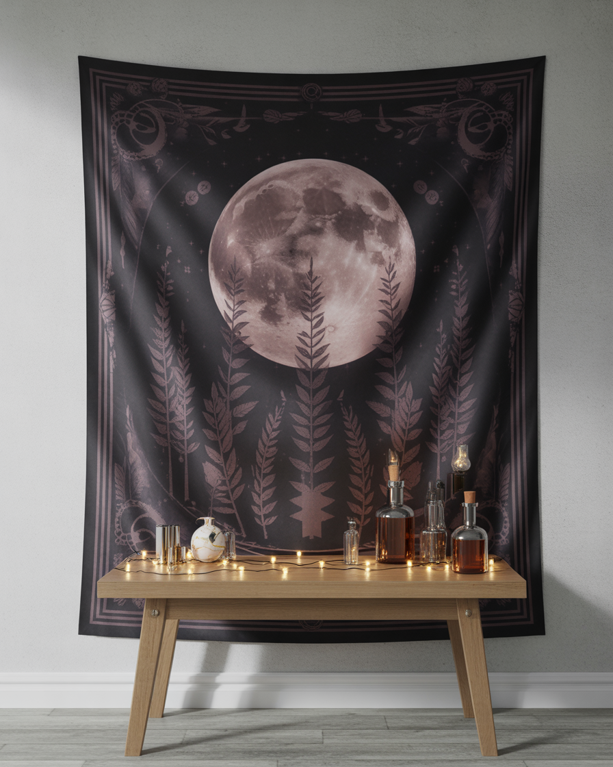 A large, moody wall tapestry featuring the moon, witches, or a mystical forest instantly sets an aesthetic dark tone. Decorate with the warm string lights and have some side table close by your ideas diy potion bottle or candle jars. This is perfect for transforming a plain wall into a focal point.