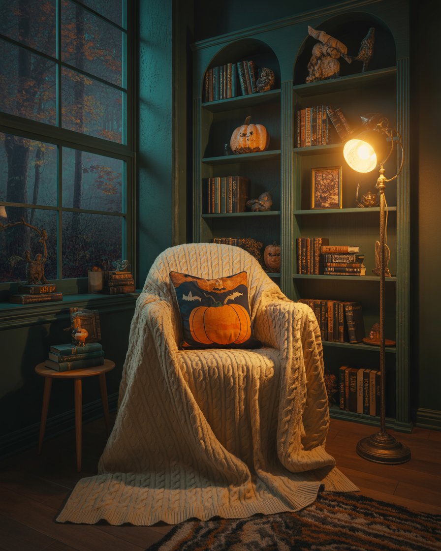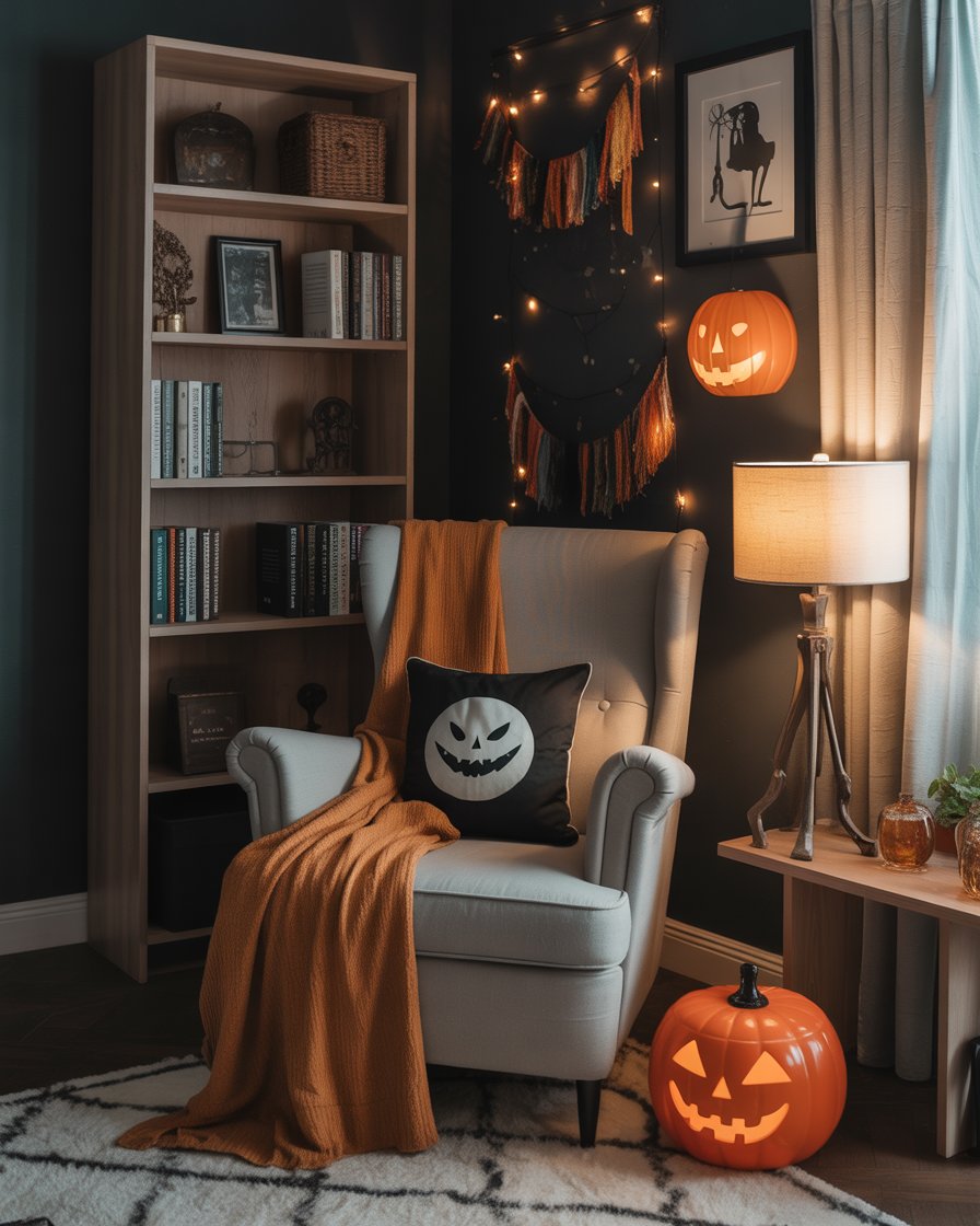 Create an aesthetic cozy reading corner in your bedroom with a plush armchair, a soft throw, and a small bookshelf. Add Halloween bedding-themed pillows for a seasonal touch. This is one of those ideas bedrooms upgrades that turns cool fall evenings into your favorite part of the year.