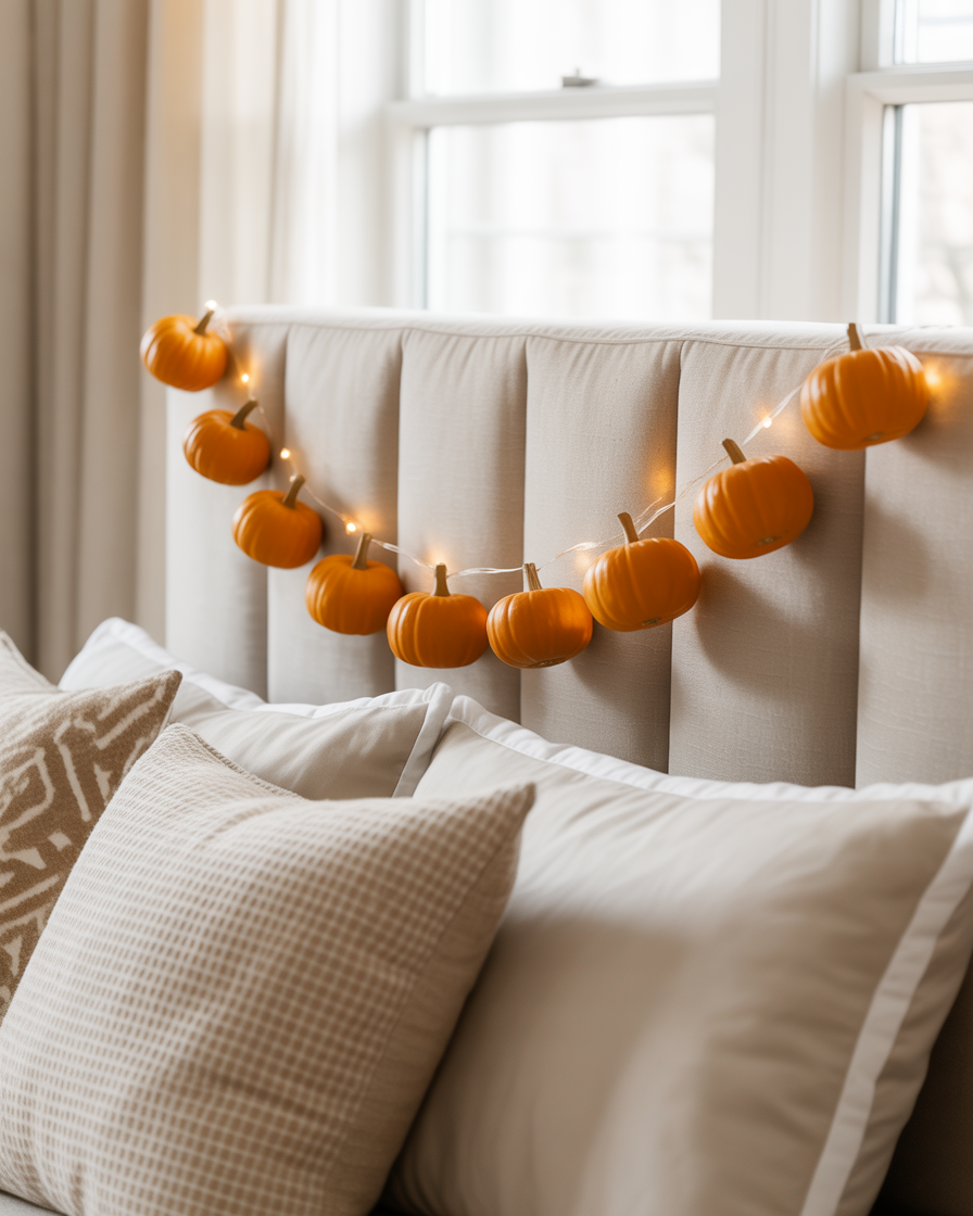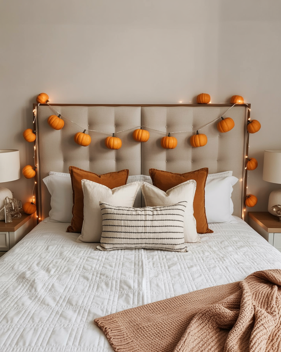 For a preppy Halloween look, choose a pumpkin light garland with gold details. Make it go around the head of a bed, or around a shelf. Team it with white, beige and orange color schemes to create a seasonal but clean look. This is an easy diy you can also make with fabric pumpkins.