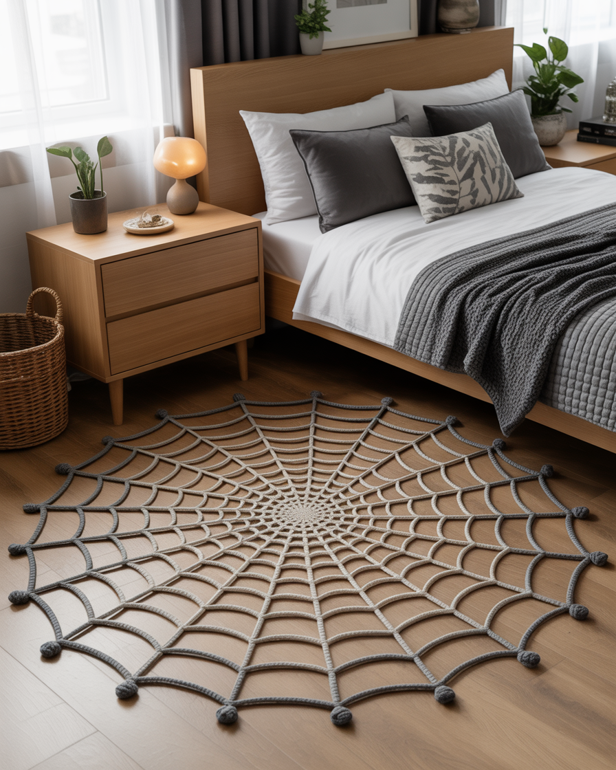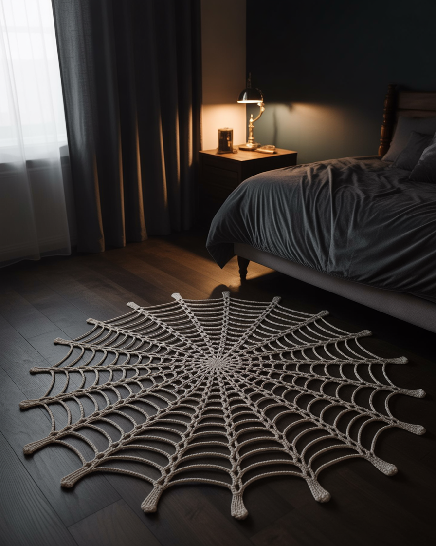 A crochet spider web rug is the perfect blend of cozy and spooky. Select color schemes such as classic black, to pale gray according to your decor. This aesthetic diy piece works beautifully beside the bed or as a small accent in front of a reading chair.