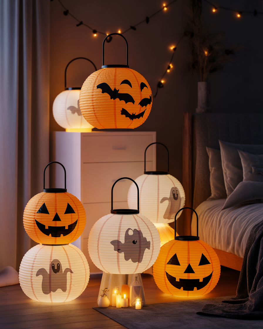 Group together lanterns of different sizes, painting them with pumpkins, ghosts, and bats. An easy diy project that can also bring light and character to your bedroom, totally suitable to Halloween nights. Arrange them in a corner or beside your bed for a warm glow.