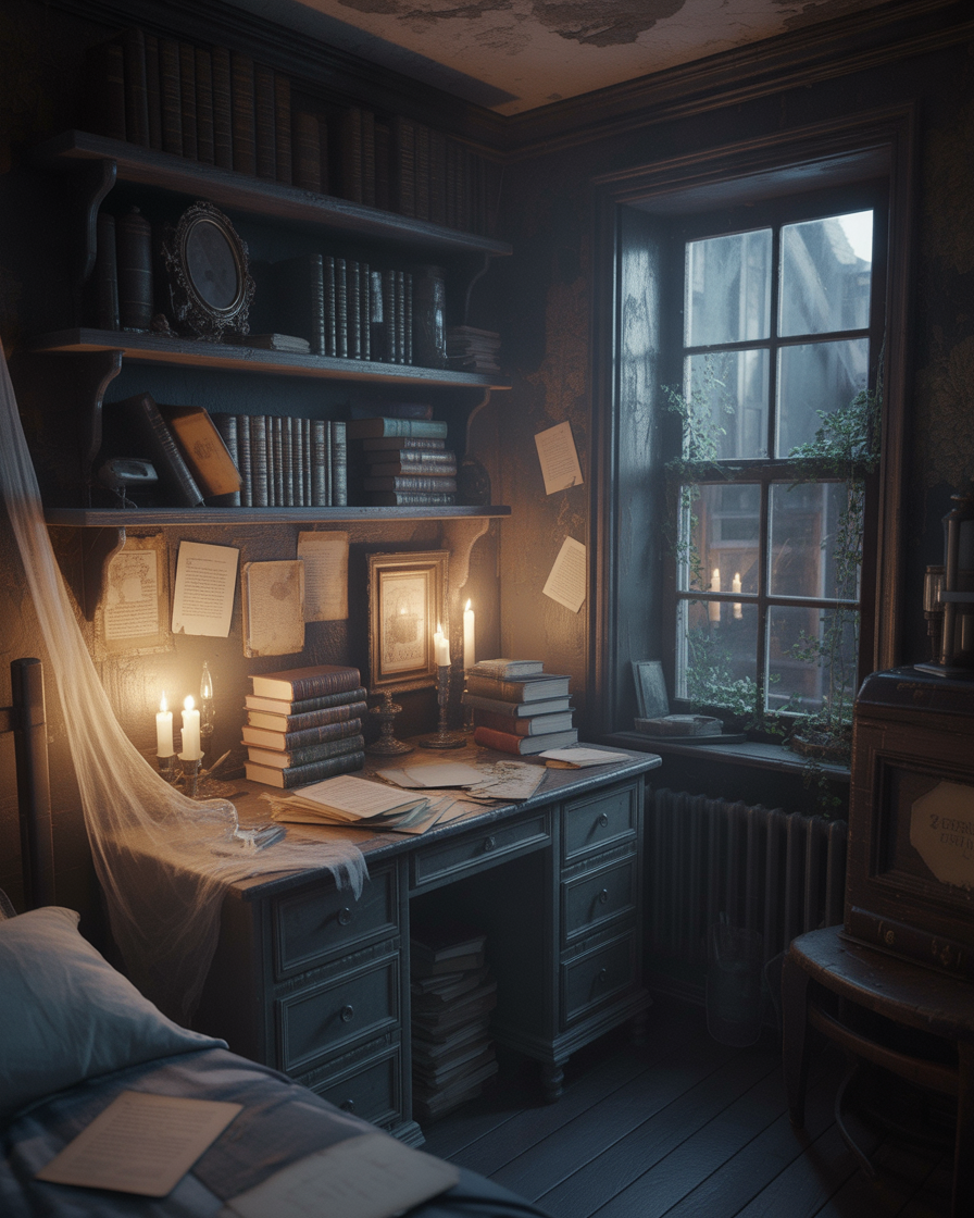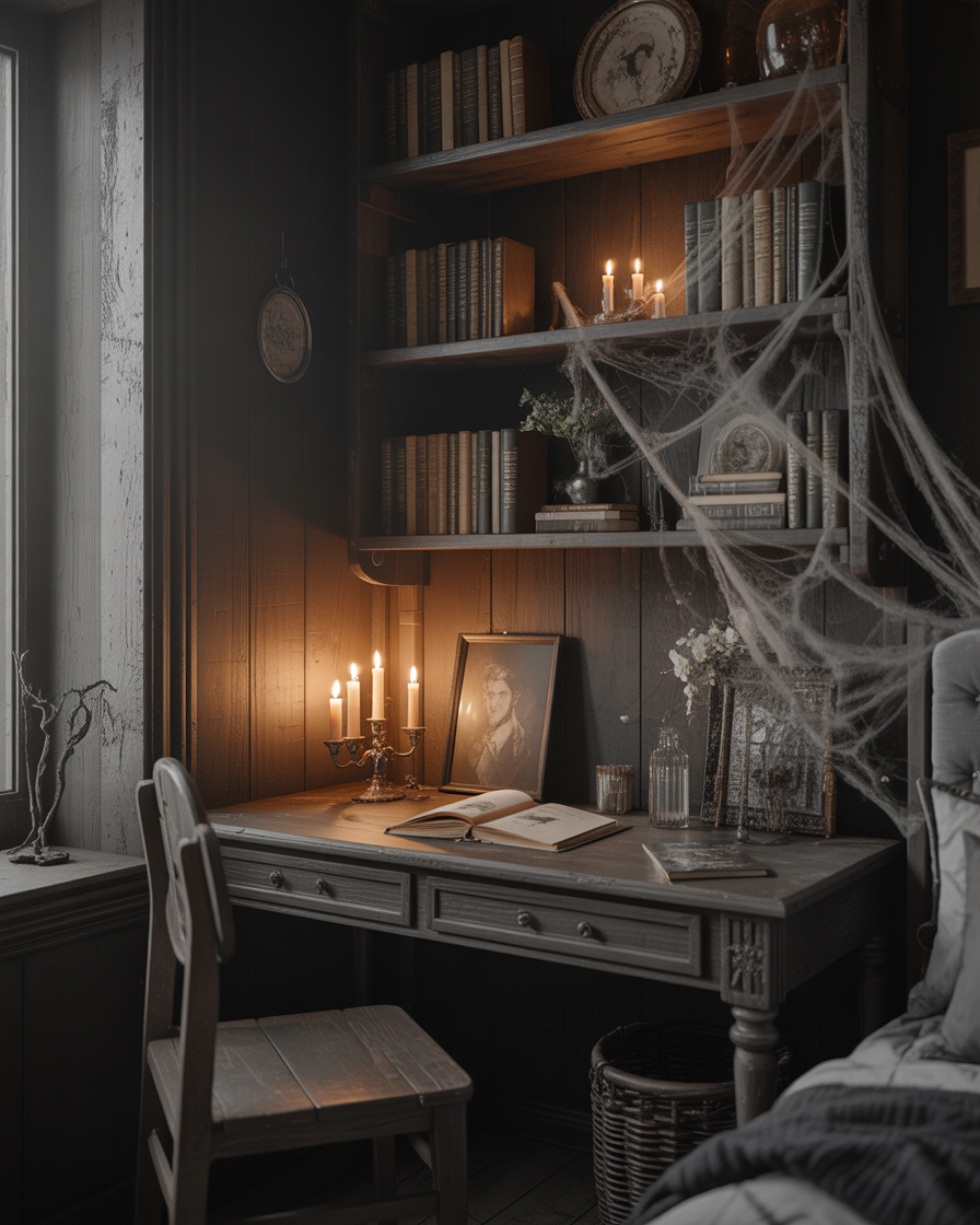 For those who love vintage style and aesthetic dark themes, a haunted study nook is perfect. Apply pieces of furniture that look aged, wood shelves with scars, and soft lamps in amber. Include some rustic paper scrolls, fake cobwebs, and diy candle holders so that scholars have an eerie effect. The look will suit any bedroom with an excess amount of space or any home library as well. The result? A setting straight out of a gothic novel.