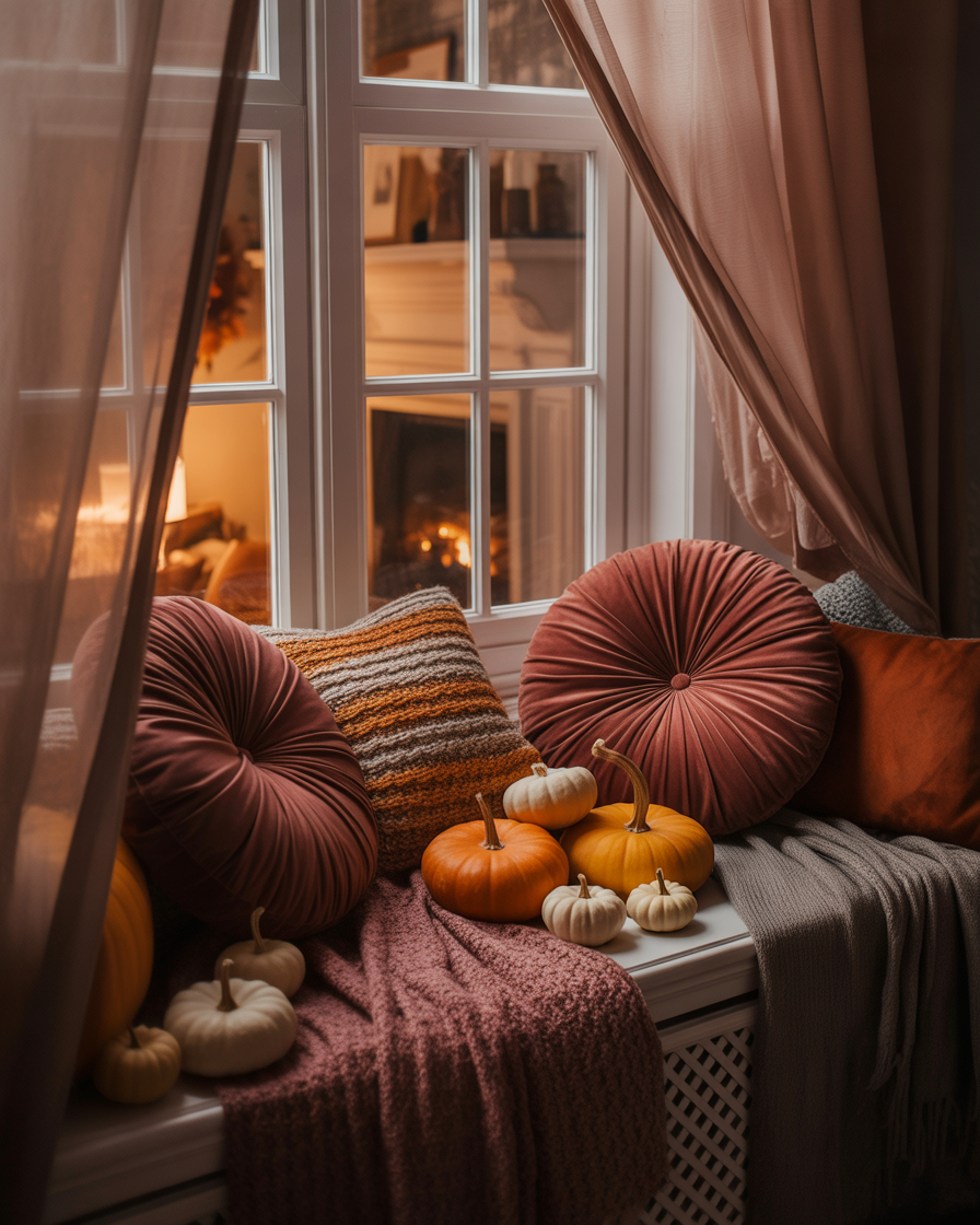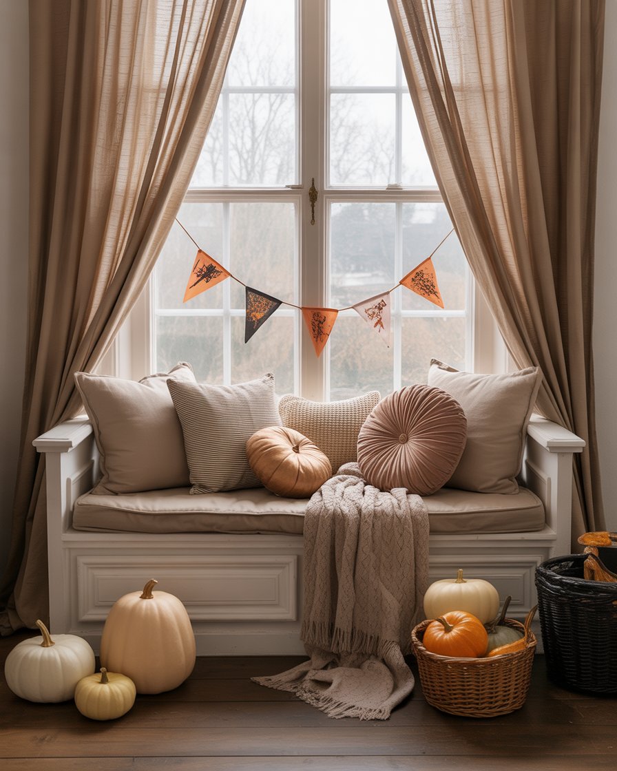 If your bedroom has a window seat, dress it up for Halloween with layered cushions, Halloween bedding throws, and small decorative pumpkins. Add sheer curtains for a dreamy, aesthetic cozy feel. This is one of those ideas diy setups that feels luxurious yet attainable.