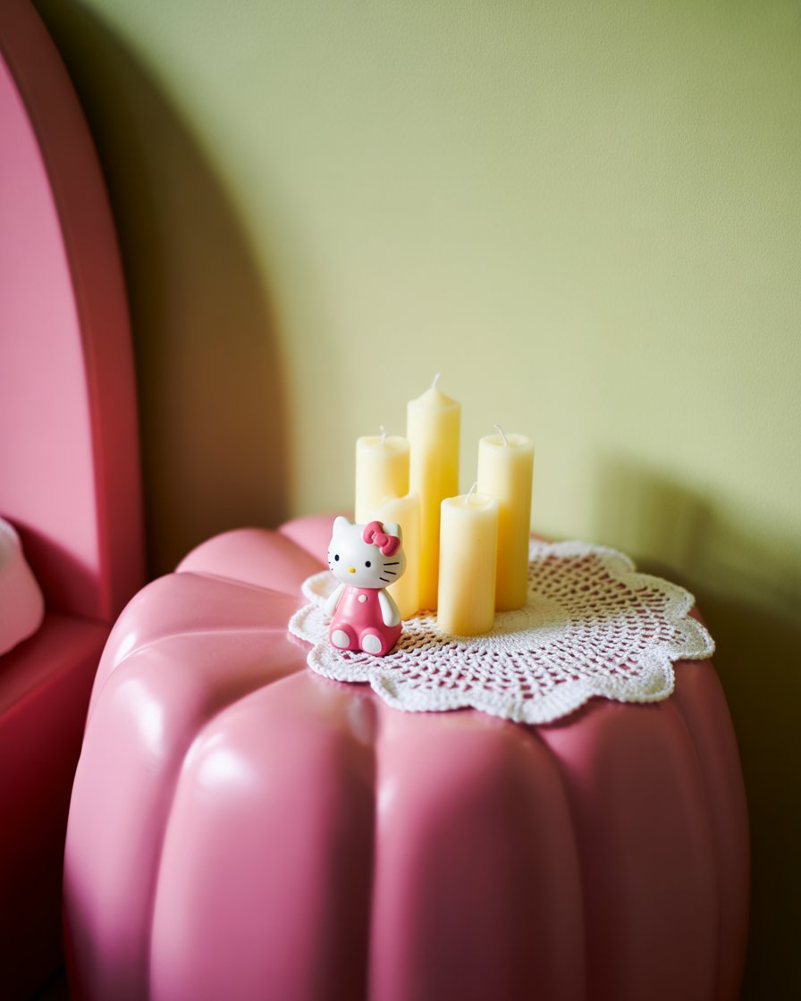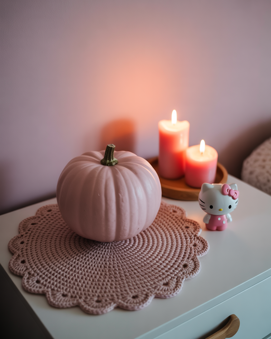 Transform your bedside table with pastel pink pumpkins, aesthetic cozy candles, and a mini Hello Kitty figurine wearing a witch hat. It is a simple DIY that is suitable in the rooms frequented by the lovers who like crafty color schemes more than loud ones. Add a lace doily or small crochet mat for texture.