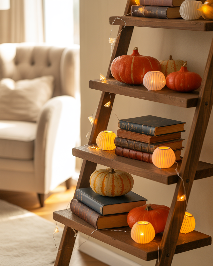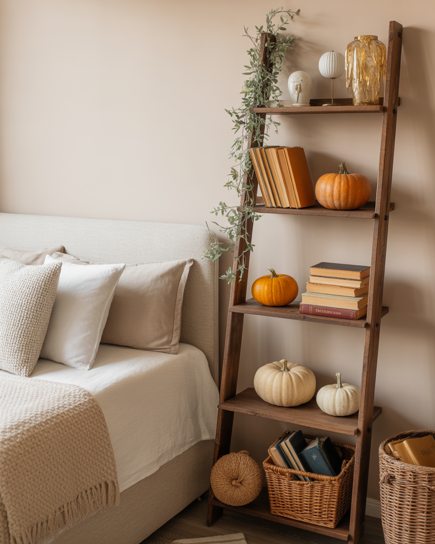 A wooden ladder repurposed as shelving is the perfect rustic base for seasonal styling. Dress the rungs and vintage books and ideas diy sum with little pumpkins, painted paper lanterns, and mini pumpkins. This setup works in a bedroom corner without taking up much space while keeping everything visually appealing.
