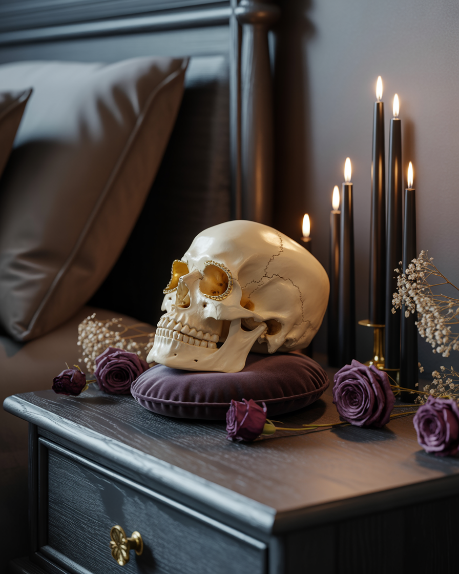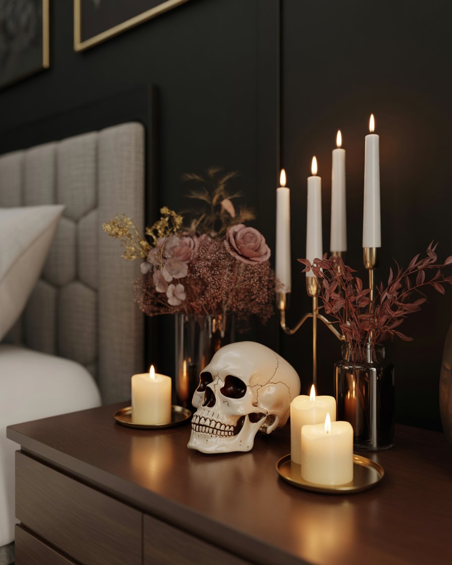 For a bolder approach, create an aesthetic dark vignette with black skull decor, candles, and dried flowers. Achieve a dramatic effect through using colors in black, deep burgundy and gold. This aesthetic diy works on a dresser, windowsill, or floating shelf and instantly sets a moody tone.