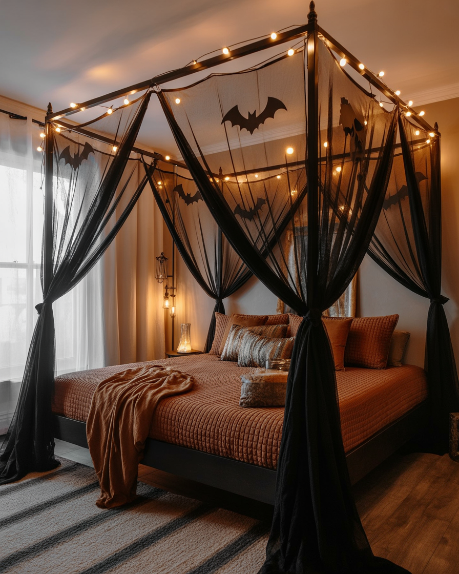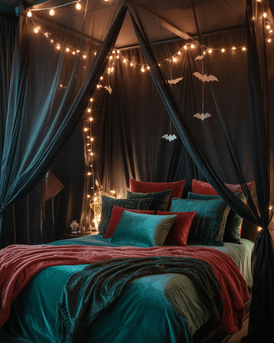 Turn your bedroom into a dramatic focal point with an aesthetic dark canopy draped in sheer black fabric. Hang string lights under it to create some mysterious, but haunted lighting. Match with Jeweled Halloween bedding and simple diy paper bats in the ceiling. This look blends romance with just the right touch of mystery.