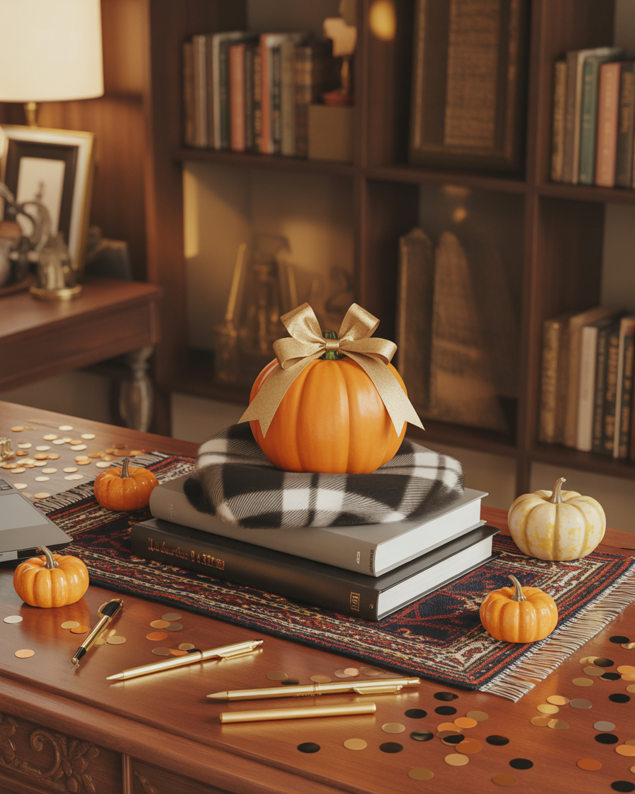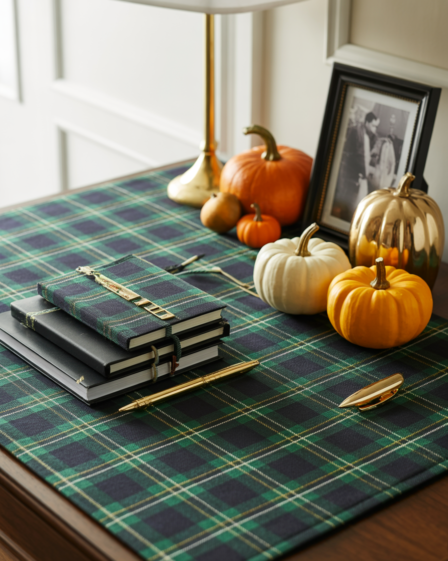 For a preppy twist on Halloween decor, think plaid color schemes, mini pumpkins, and gold-accented stationery. Add simple do-it-yourself oranges and blacks wrapped garlands and ensure you clean up your work area to get a neutral yet autumnal atmosphere. This approach works especially well in small apartments where your desk doubles as decor central.