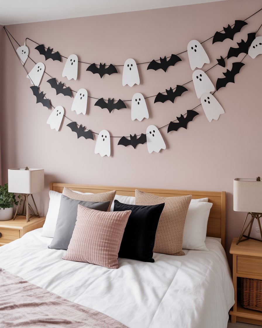 Few decorations are as easy and effective as a paper garland. Bats are done on black paper and ghosts on white so it will be possible to strand them, with a black backing, along the wall over your bedroom headboard. It is a diy that only takes less than an hour, yet it completely changes the vibe it has. Bonus: Kids and adults alike love helping with this project.