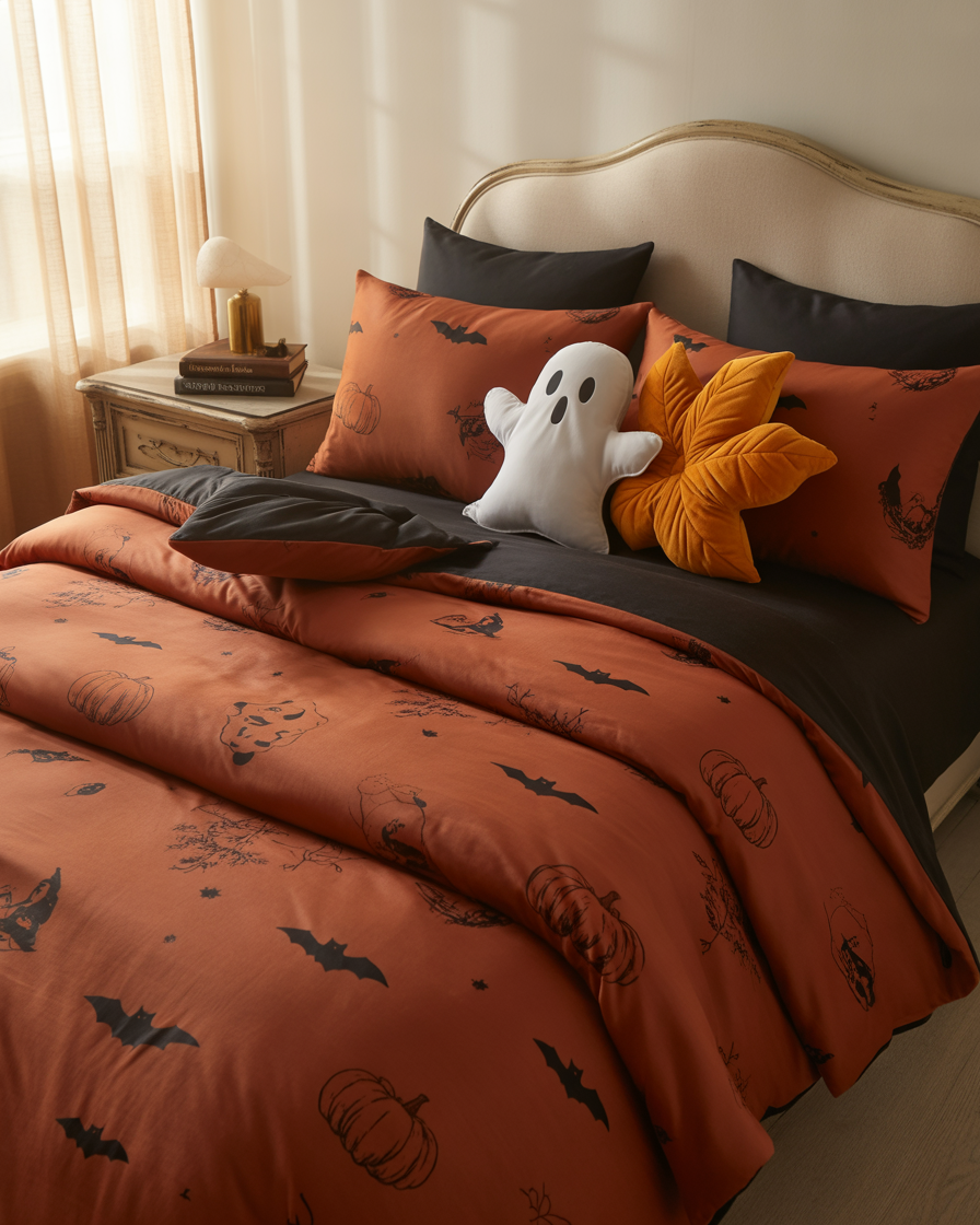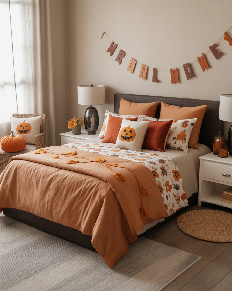 Changing your bedding is one of the fastest ideas bedrooms transformations. Go pumpkin crazy with Halloween bedding in pumpkin, black cat or low-key coloring such as burnt orange/charcoal. Include some cosy blankets and cushions to be both warmer and textured. It’s a simple ideas diy update that makes your space feel instantly festive.