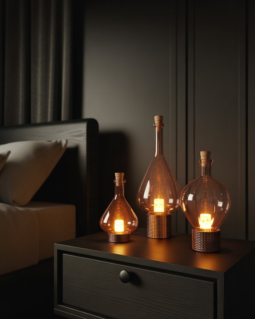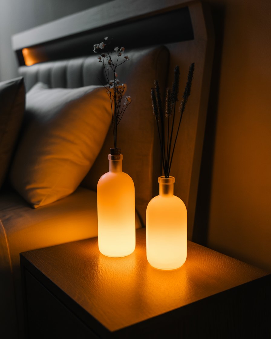 Turn plain glass bottles into glowing “potions” with LED lights and food coloring. This simple diy idea is gorgeous on nightstands or shelves and can be placed in aesthetic dark rooms as well. Label them with spooky names and arrange alongside books for an immersive experience.