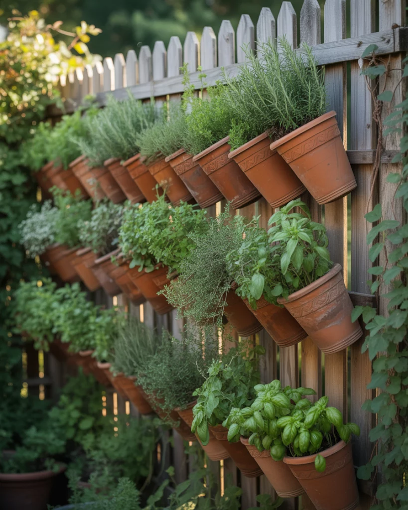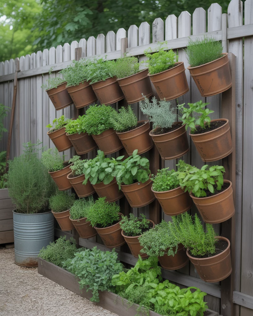 A hanging herb garden adds greenery without taking up ground space. Put baskets or containers mounted in the walls along fences or outside patios. Outdoor vertical walls to grow vegetables and herbs can mix both form and function as I have seen DIYers on Pinterest create some vertical herb walls out of plain fences with minimal tools. For renters especially, it’s a simple DIY solution that doesn’t require digging.