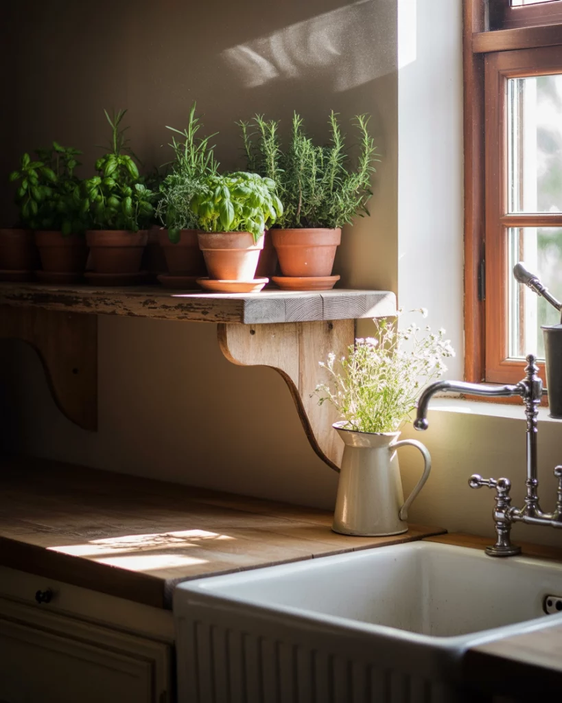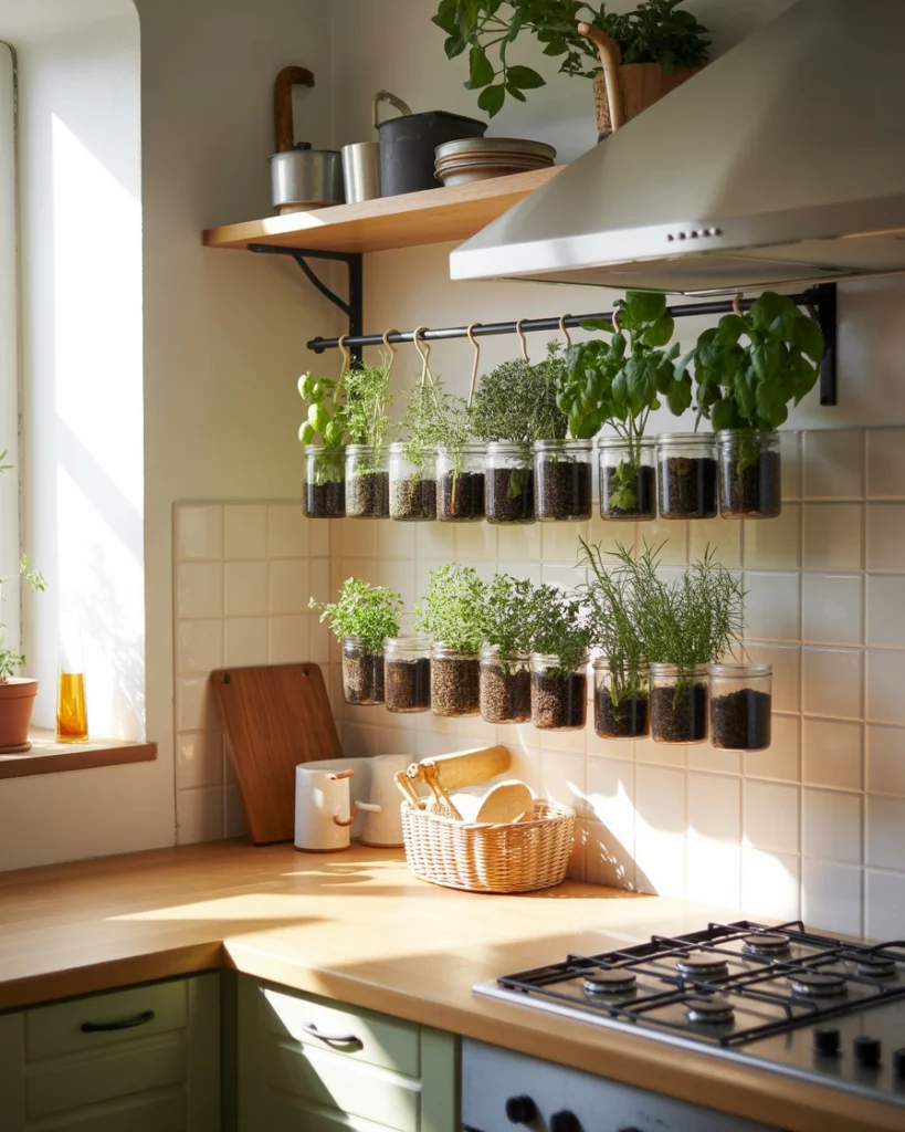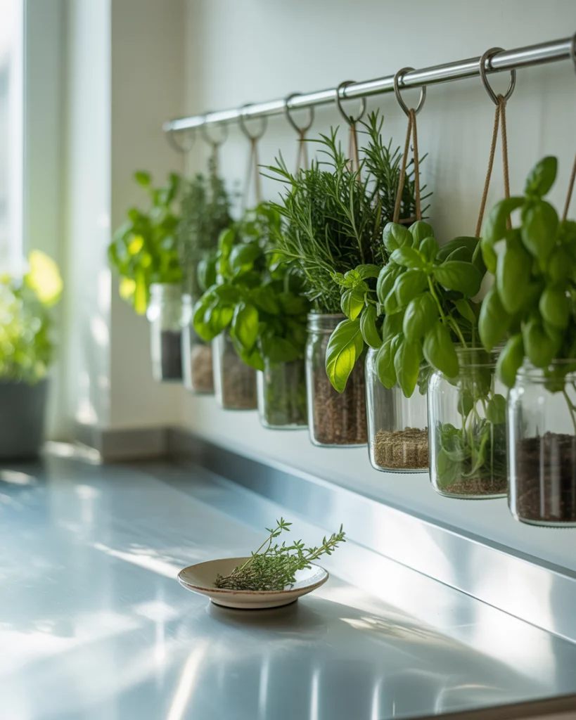 Install a metal or wooden rail above your kitchen sink and hang small planters from hooks. This indoor solution is simple to water and leaves counters open. I once gave it a go and saw it in a Scandinavian design blog- I found it modern, minimal and super practical in everyday cooking. Herbs like basil and thyme thrive in this setting.