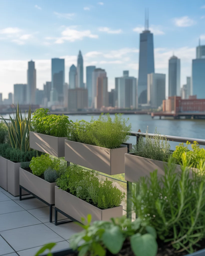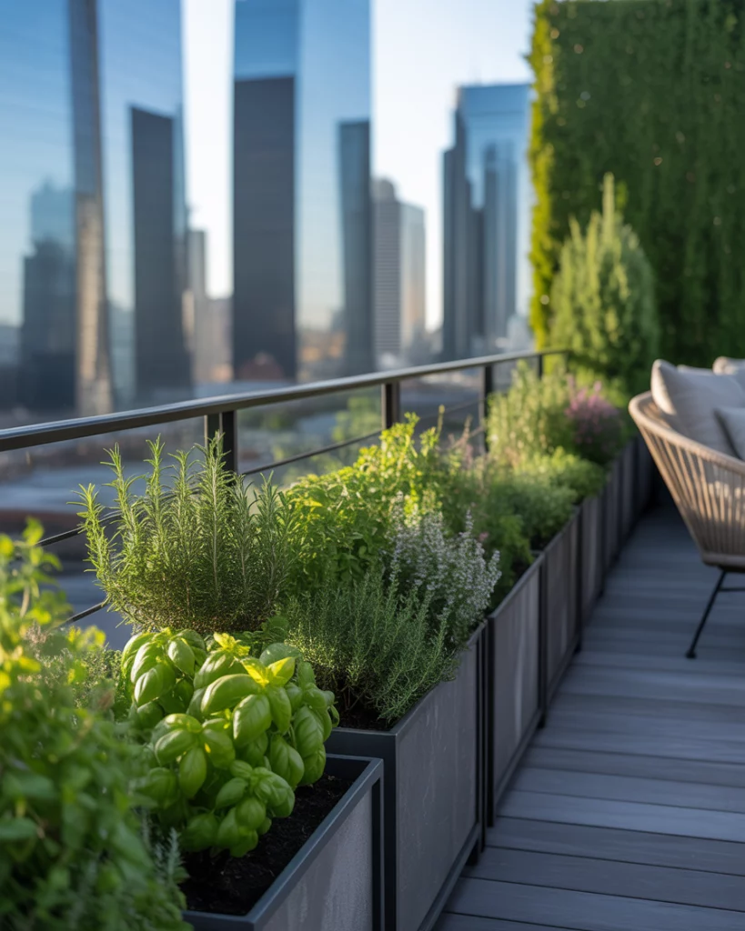 Maximize your terrace by attaching long planters to the railing. Basil, cilantro and rosemary herbs do wonderfully in containers here and help provide a green screen of privacy. A friend in Chicago uses railing planters not only for herbs but also to block the view of the neighboring high-rise—functional and stylish.