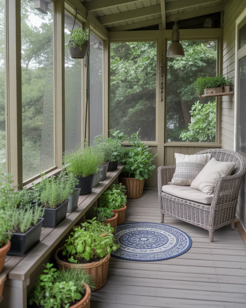 A screened in porch is a dream space for an herb garden because it combines fresh air with protection from pests. Mint, lemon balm and oregano thrive here creating a relaxing scent as you enjoy the tea in a book. I have even seen designers on Houzz introduce decks with all the planting containers placed on it- half a home decoration, half a culinary delicious usable supply. It’s like extending your living room with greenery.
