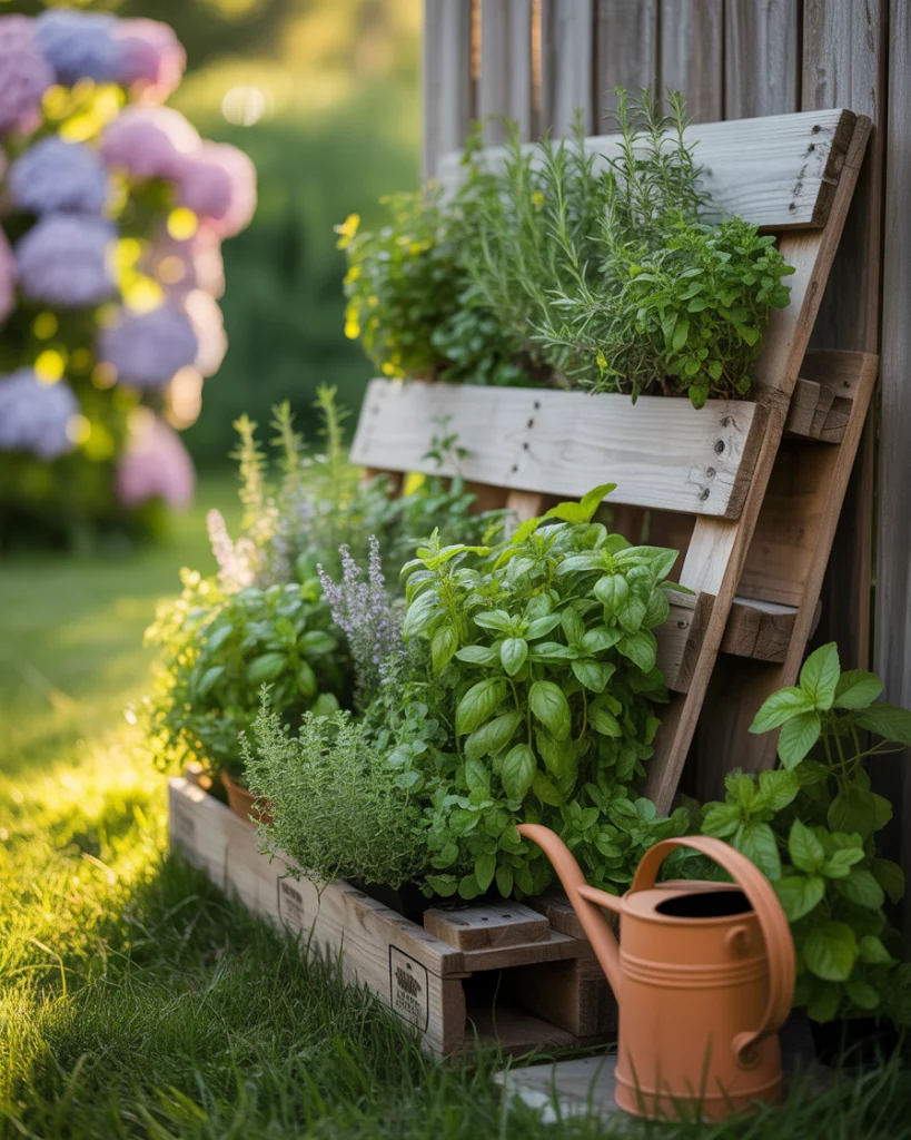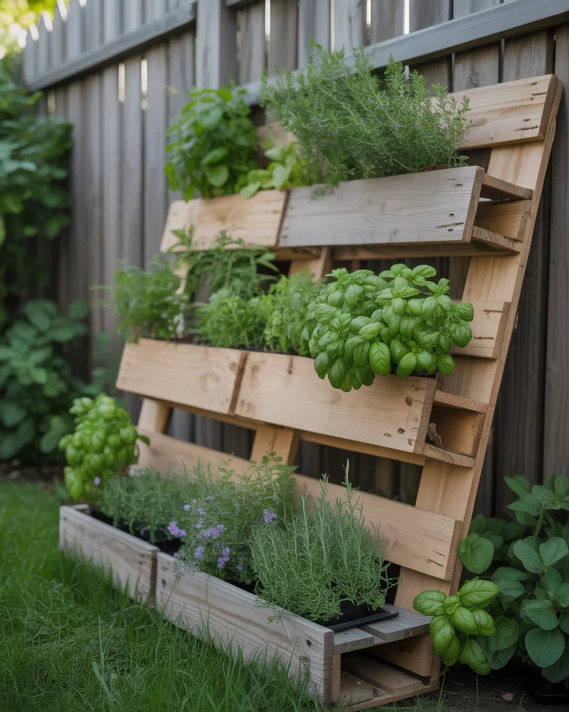 An old wooden pallet can be repurposed into a vertical herb garden—an easy outdoor DIY project for backyards or patios. Fill the slats with soil and then plant some herbs such as parsley, sage and cilantro. I have seen one built by a family in their back yard and it converted what would ordinarily have been an uninteresting fence row, to a rustic and useful farm asset. Affordable, sustainable, and creative.
