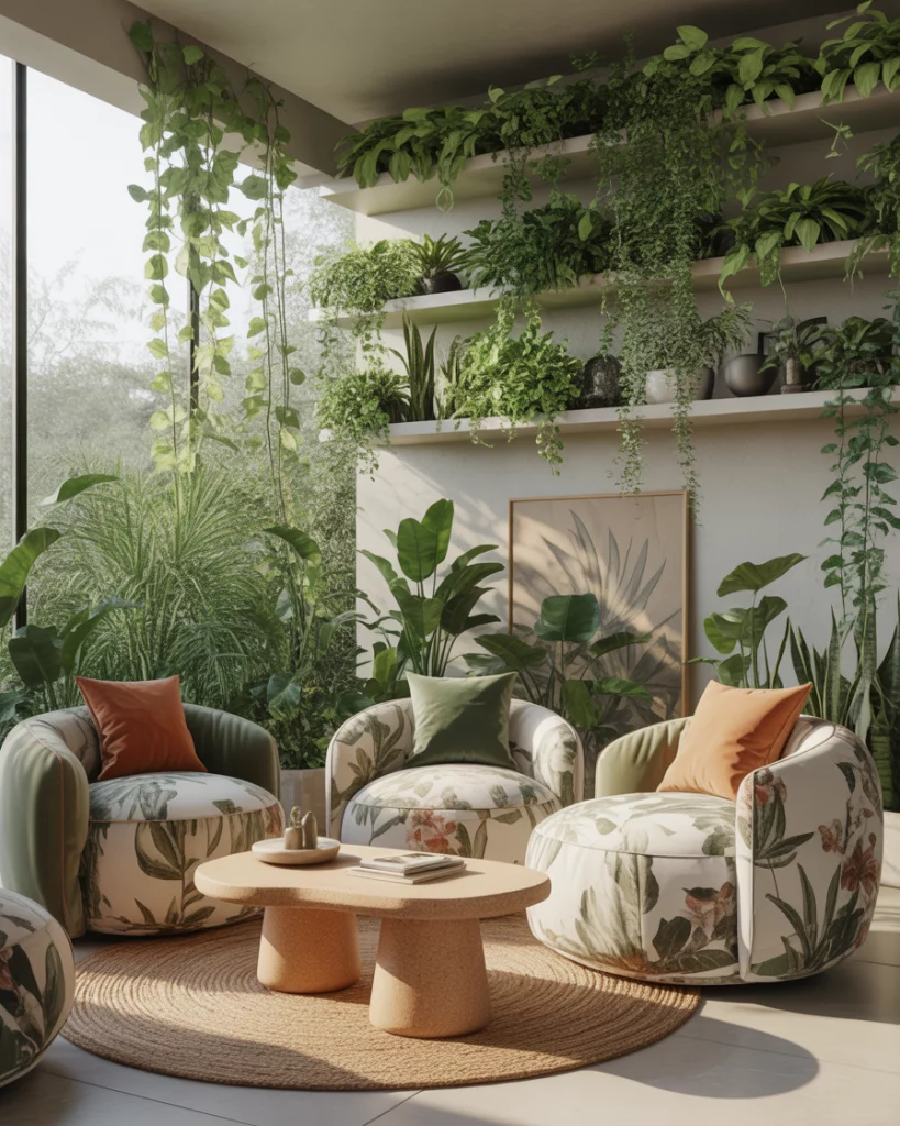 Adding layers with botanical features such as potted trees, vines, and leaf-patterned fabrics helps to bring life to any living room, apartment, and/or small space. Modern designers in 2026 like to combine natural plants with leaf-patterned cushions or art to keep design balanced and interesting. I implemented this design idea within our home after having winter blues, and our home instantly appeared more welcoming because of the added plants.