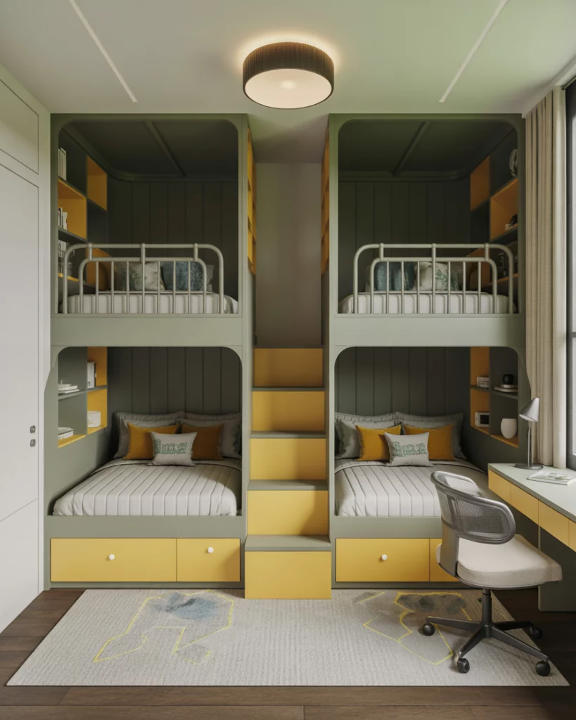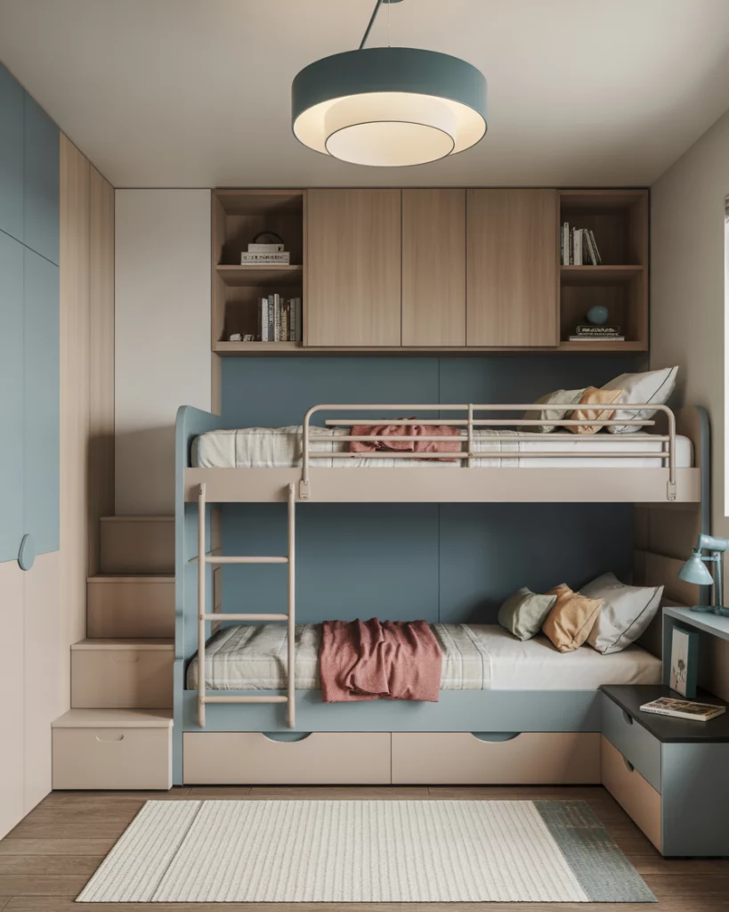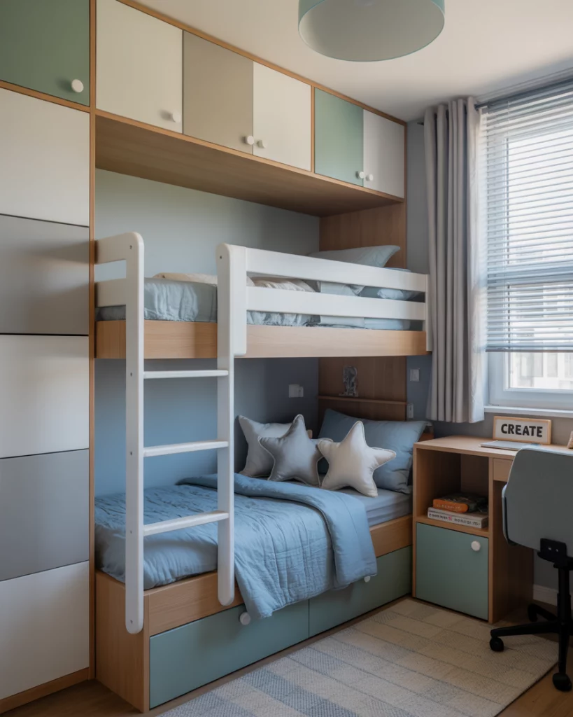 Not every family has a huge house, so small 2 solutions are perfect in 2026. Clever use of bunk beds, built-in shelves, and multi-functional desks maximize even the tiniest spaces. These setups fit well in a shared room 2, or can be adapted for boys single bed layouts. A neutral or blue color palette keeps the room airy and organized. Parents love how practical it feels while still giving kids plenty of room to play.