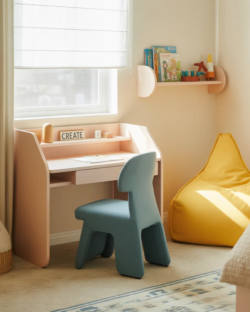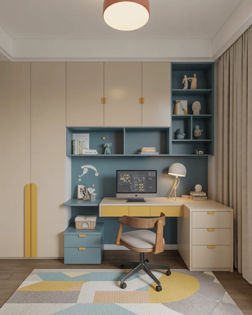 As kids spend more time learning at home, bedrooms double as study zones. A multi-functional design in 2026 combines smart desks, shelving, and even compact seating for guests. This works well in small room setups where every inch counts. Parents appreciate how neutral and blue palettes keep things calm, while cute pops of yellow or green add energy. It’s ideal for boys or shared sibling rooms where focus and play coexist.