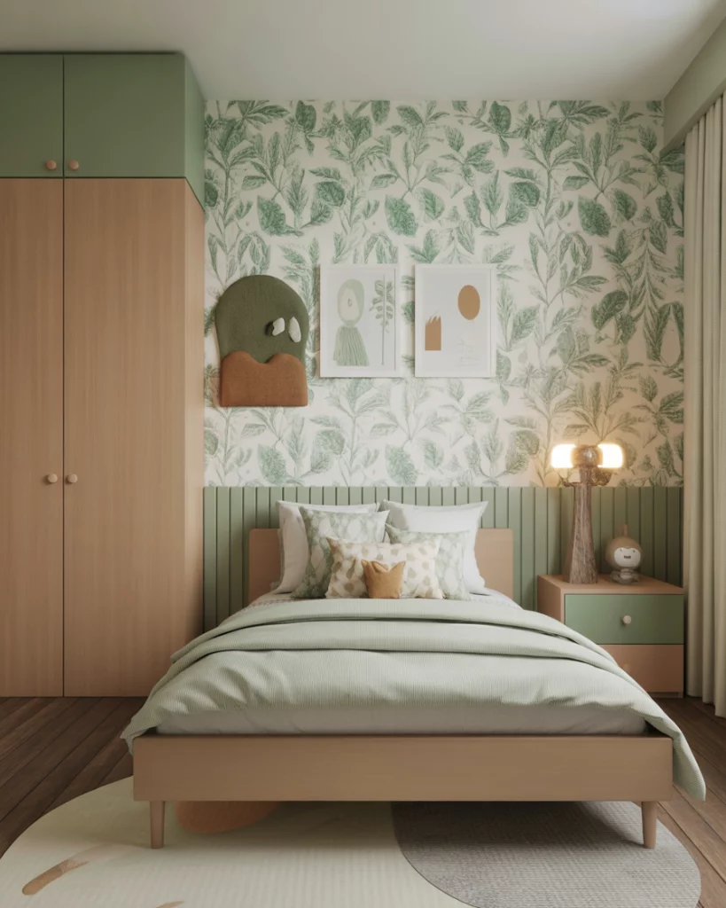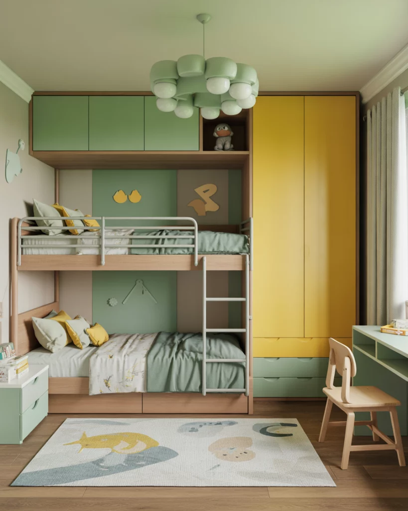 Green is the color of calm and balance, making it a favorite for eco-inspired kids’ rooms in 2026. Whether for boys or girls children, this design emphasizes plants, wood furniture, and earthy neutral tones. Families love how it brings a little outdoors inside, even in city apartments. Add Ikea woven baskets, leafy wallpaper, or climbing walls for fun. This look also works beautifully in a shared boy and girl room.