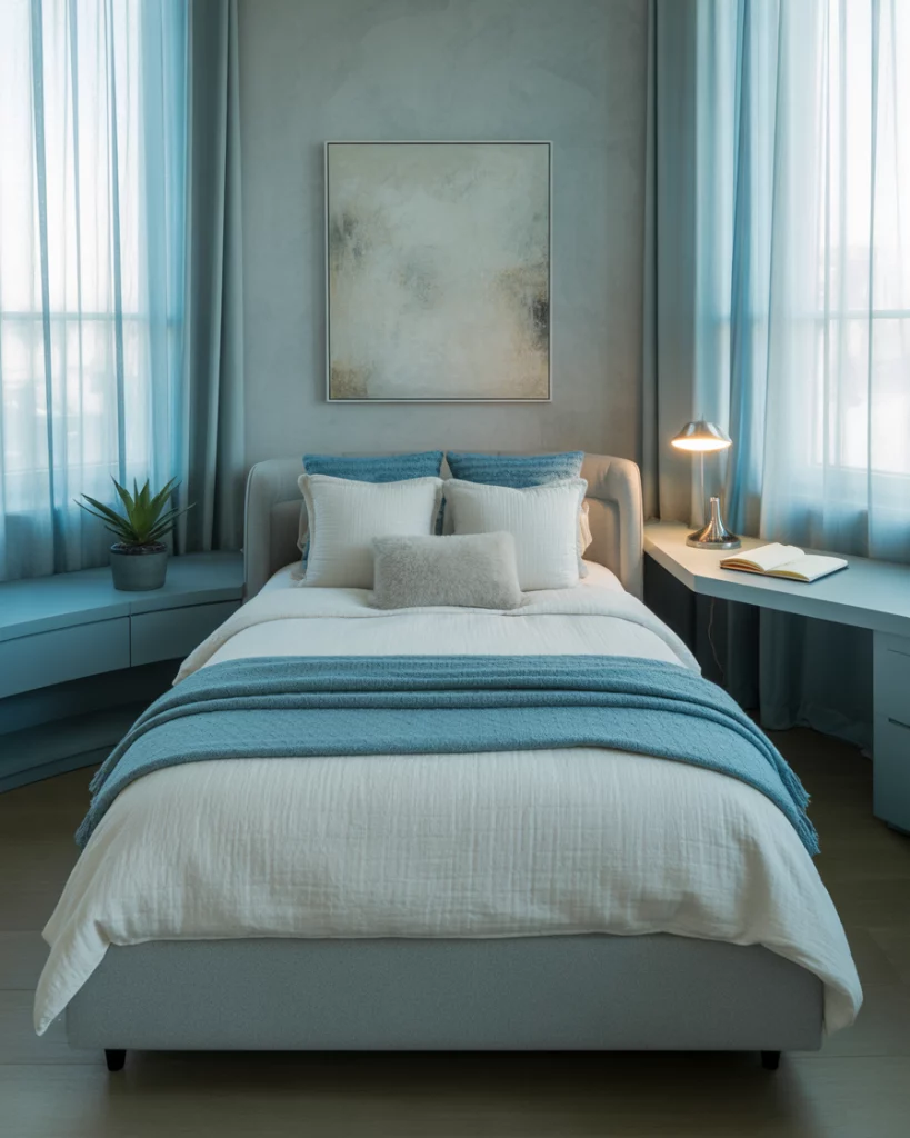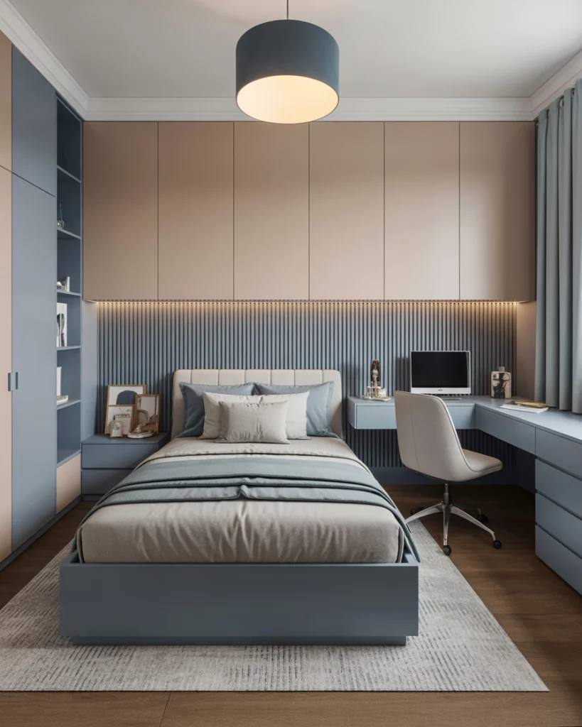 Classic blue never goes out of style for boys, but in 2026 it’s paired with smart, minimalist storage and tech-friendly touches. Parents often lean toward small room solutions with floating shelves and modular desks. For boys theme rooms, accents like sports gear or space motifs add personality without clutter. This approach creates a sleek but fun look that can easily transition into a study space as kids grow older.