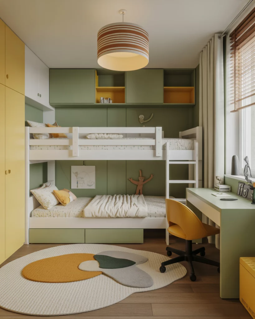 A shared boy and girl setup in 2026 balances individuality with harmony. The key is using unisex palettes—like yellow and green—with personal corners. Think bunk beds with curtains, or modular Ikea wardrobes dividing the space. It feels fun yet structured, and works even in a small room. Parents appreciate how this design avoids gender clichés while still giving each child a sense of ownership.